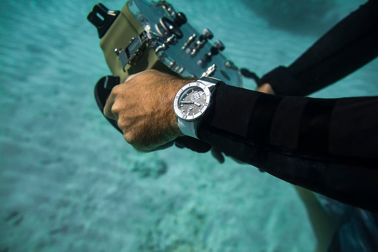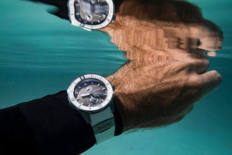 Per completare il libro Surface, in cui racconta i segreti della sua arte, Thouard si è lasciato accompagnare al di sotto della superficie dal Great White 44 mm di Ulysse Nardin con cassa e lunetta in titanio, uno dei modelli di punta della collezione Diver. Spinto dal movimento UN-118 con riserva di carica di 60 ore, un segnatempo impermeabile fino a 300 metri di profondità, perfetto per chi ama esplorare le meraviglie più nascoste del mare. Grazie a questo fido compagno di avventure, Fred ha così potuto completare una collezione che vanta oltre due milioni di foto emozionanti, tutte realizzate al di sotto della superficie nei luoghi più suggestivi della Terra.