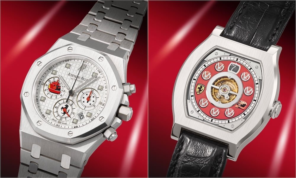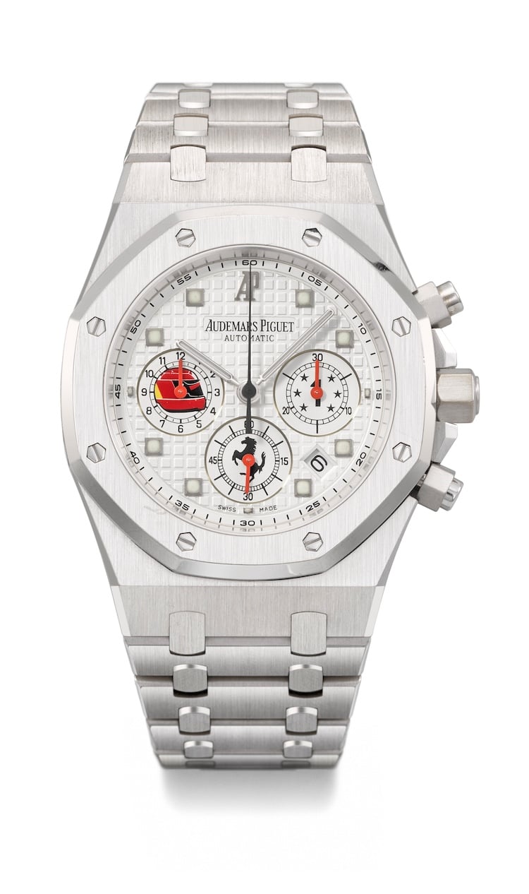 Tra i segnatempo che saranno battuti, un Royal Oak in oro bianco con quadrante personalizzato, che presenta il famoso emblema del cavallino rampante della Ferrari sul quadrante secondario dei secondi. Il numero “1” nel contatore dei 30 minuti è circondato da 6 stelle che rappresentano le 6 vittorie nel Campionato del Mondo di Michael Schumacher tra il 1994 e il 2003, mentre nel contatore delle 12 ore è raffigurato il casco da corsa rosso del pilota. Un cimelio unico, visto che reca una dedica personale incisa sul retro della custodia realizzata da Joan Toad, storico mentore di Schumacher.
