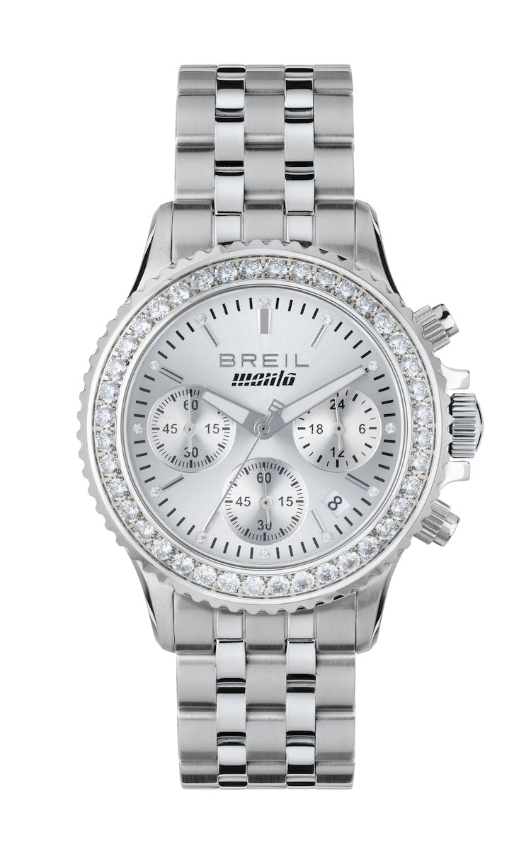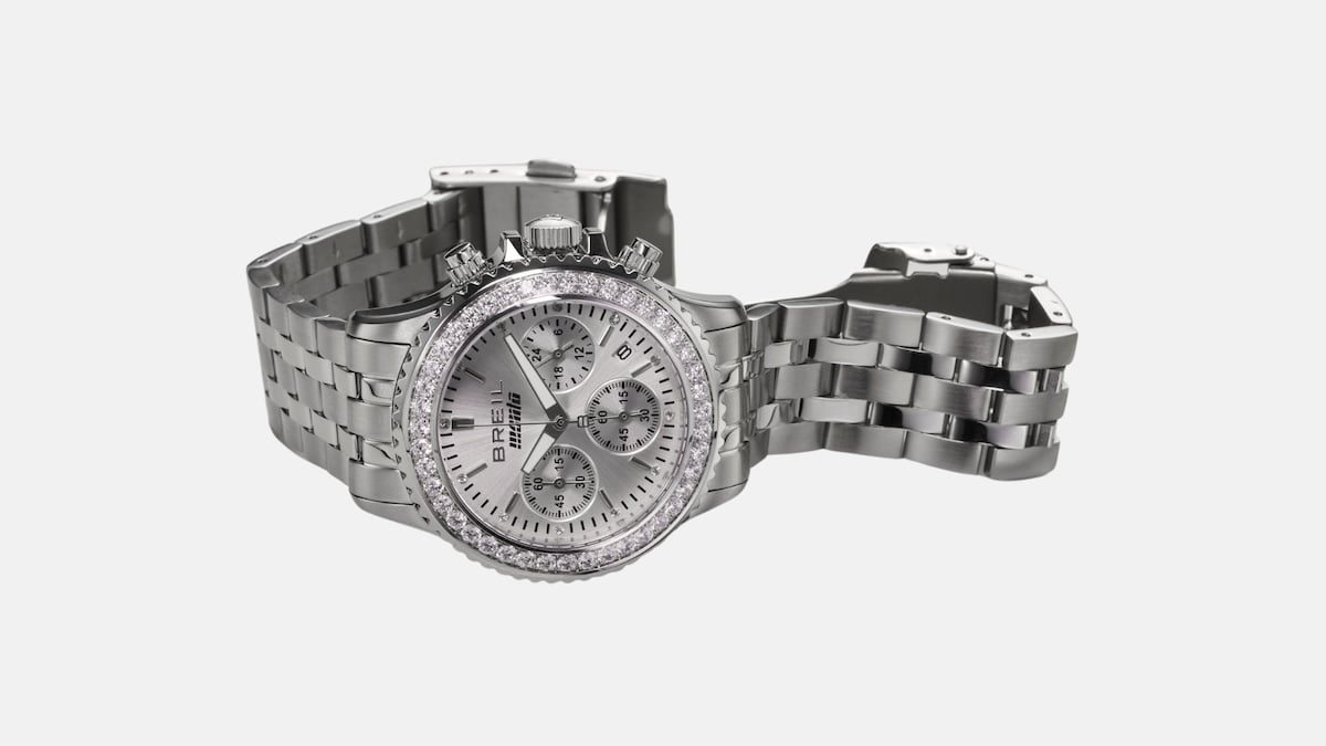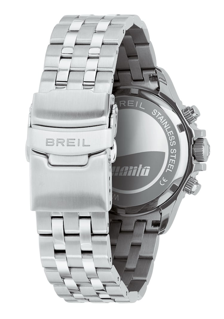 Sul quadrante silver effetto sunray, con datario tra le ore 4 e le ore 5, spiccano indici incastonati di zirconi e lancette luminescenti, che assicurano leggibilità anche in condizioni di scarsa luce. Un dettaglio unico è rappresentato dalla “B” di Breil posizionata sulla sfera dei secondi, un tocco distintivo che richiama l’identità del brand.
