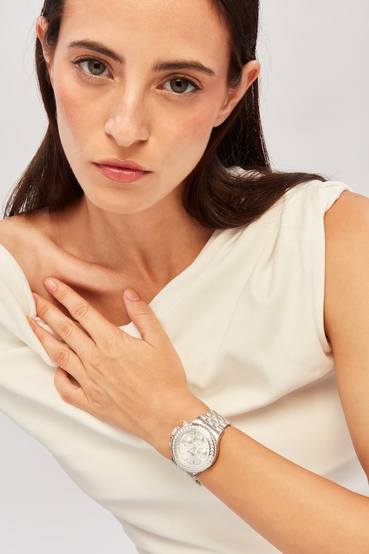 Il Manta Chrono Lady si distingue per la cassa in acciaio da 36,5 mm con finitura bilux, lucida e satinata, arricchita da una lunetta impreziosita da 43 cubic zirconia.