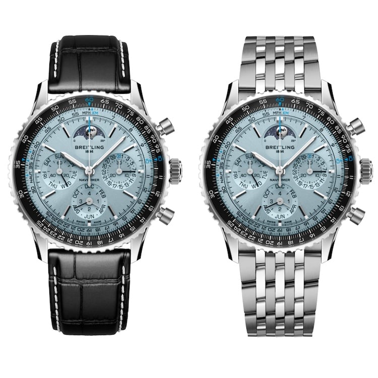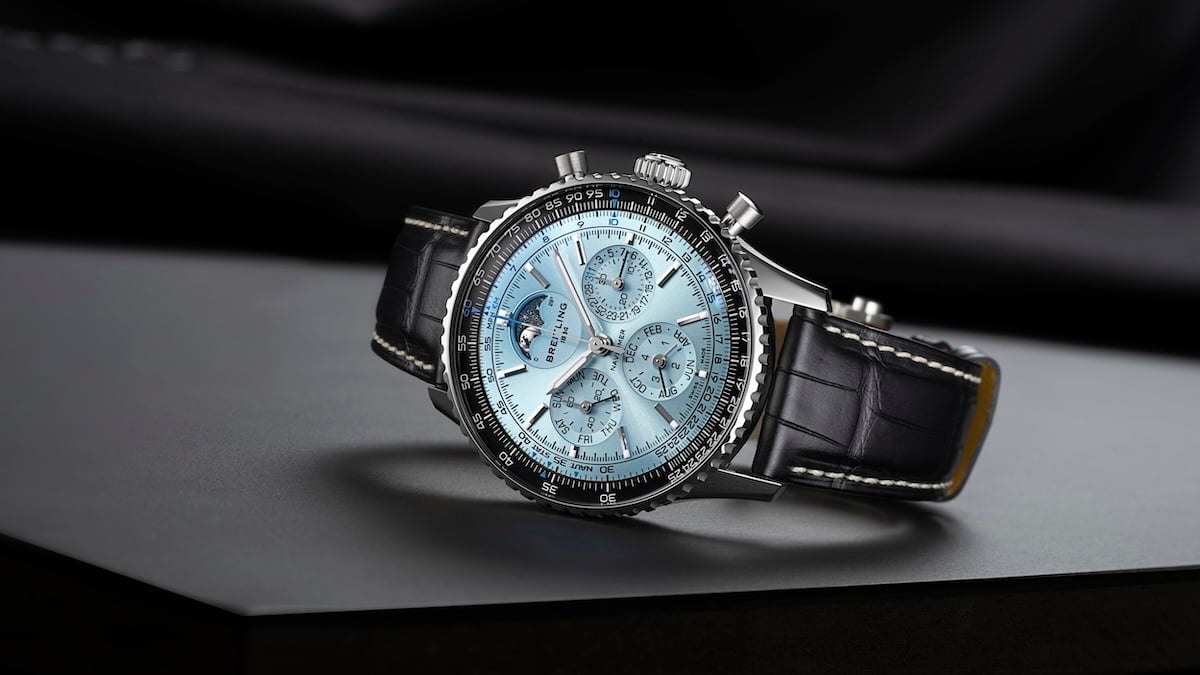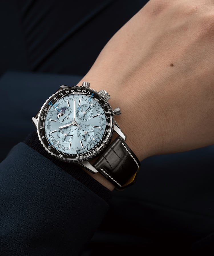 Il quadrante blu ghiaccio dona al Navitimer B19 un aspetto sofisticato e contemporaneo, mentre la lunetta in platino aggiunge un tocco di esclusività. La cassa in acciaio da 43 mm mantiene l’equilibrio tra presenza al polso e comfort, con un’impermeabilità fino a 30 metri. I pulsanti a fungo garantiscono un utilizzo agevole delle funzioni del cronografo, mentre gli indici e le lancette luminescenti Super-LumiNova assicurano la massima leggibilità in ogni condizione di luce.