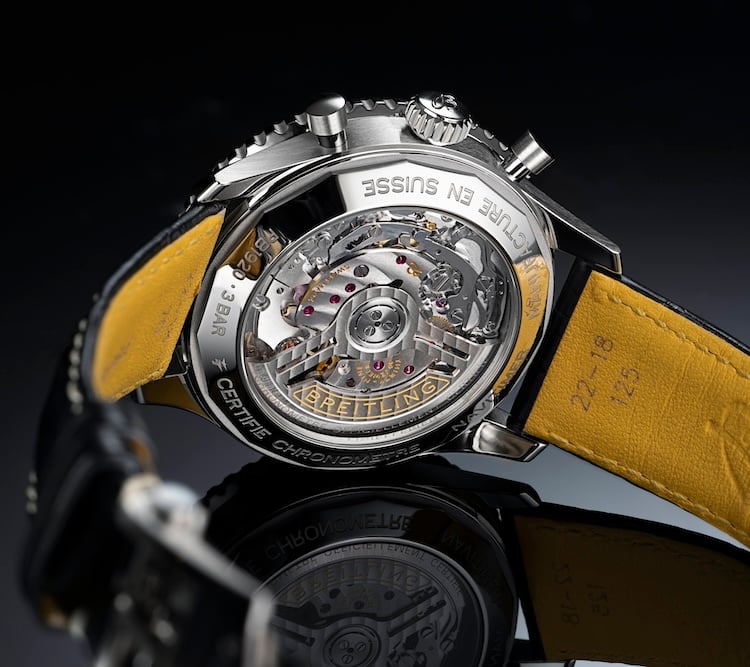 Il cuore pulsante di questo Navitimer è il calibro B19, un movimento automatico con cronografo e calendario perpetuo, capace di adattarsi automaticamente alle variazioni del calendario, inclusi gli anni bisestili. Con una riserva di carica di 96 ore, il B19 è progettato per offrire prestazioni di lunga durata. Testato con oltre 100.000 giri di corona e 60.000 urti a 500 G, questo movimento certificato COSC è il risultato di un impegno ingegneristico senza compromessi. Per chi ama il lato estetico della meccanica, il fondello in vetro zaffiro offre una vista privilegiata sul movimento.