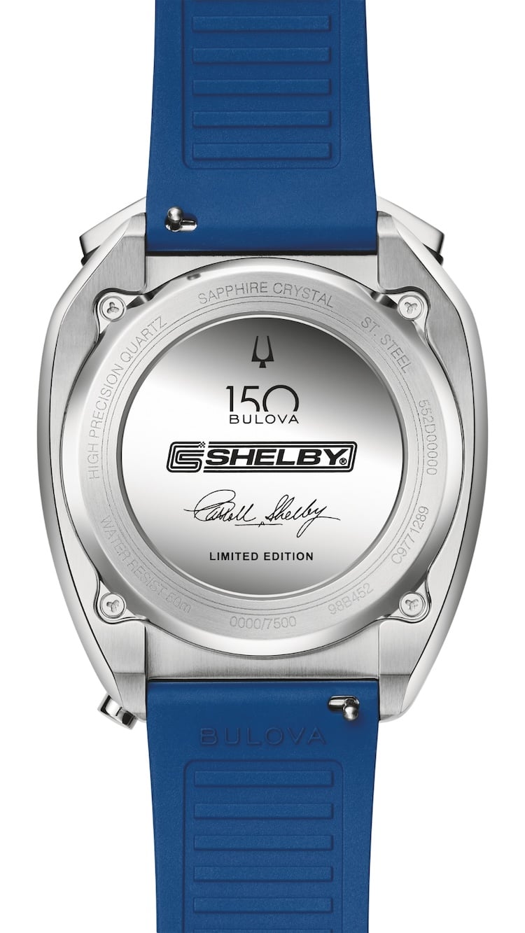Il Bulova 150° Anniversary Shelby Racing Chronograph è proposto al prezzo di 1.250 euro e sarà disponibile in edizione limitata a 7.500 esemplari numerati, di cui 600 riservati al mercato italiano.