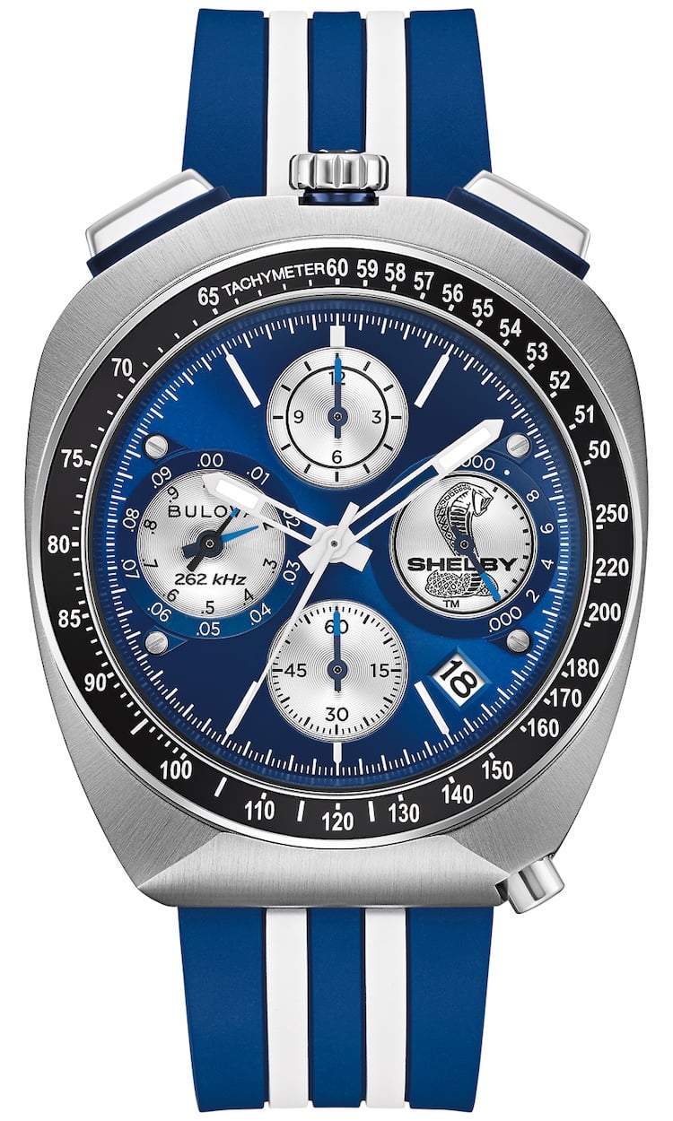 Il nuovo Shelby Racing Chronograph si riconosce immediatamente per la cassa “Bullhead”, tipica della tradizione Bulova.