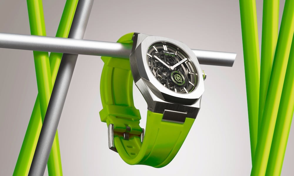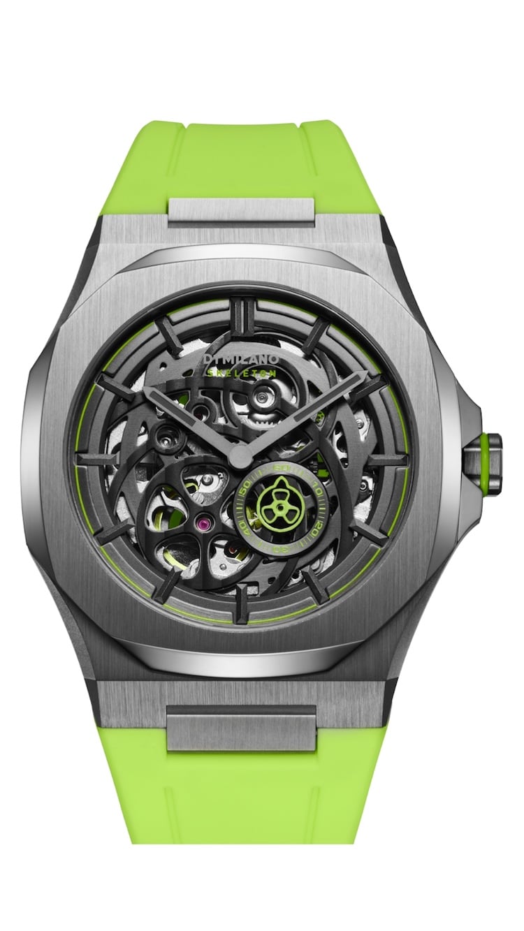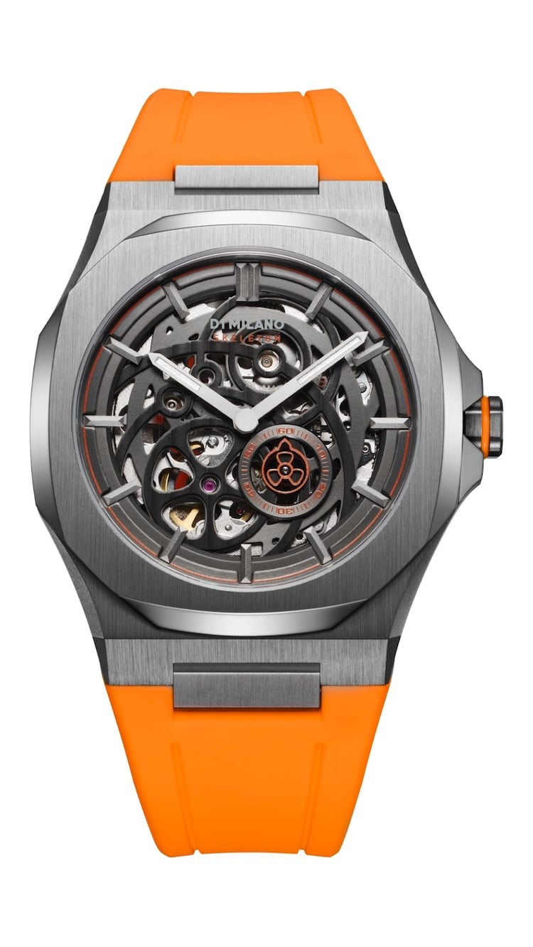 Il quadrante scheletrato integra dettagli cromatici che riprendono i colori del cinturino, aggiungendo un tocco di colore pop che rende l’orologio un accessorio distintivo e accattivante. La combinazione di design audace e comodità rende ques ti modelli perfetti sia per occasioni formali che per le avventure quotidiane. Il modello Skeleton di D1 Milano è dotato di un movimento a carica automatica a 24 rubini e una cassa in acciaio inossidabile color argento, garantendo precisione e affidabilità oltre a un’estetica impeccabile.