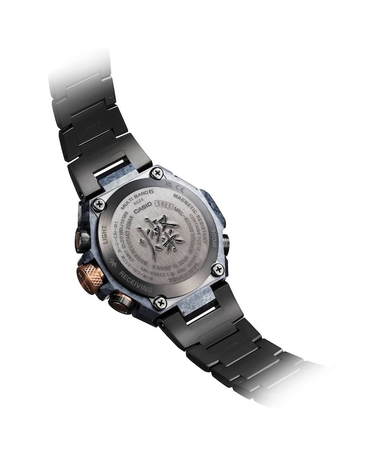 Il fondello inciso a mano, il pattern hishimaki-gara ispirato all’elsa della katana e gli indici curvi che ricordano la lama di una spada trasformano il MRG-B2000JS in un vero omaggio all’arte giapponese. Questi dettagli, curati dall’artigiano tradizionale Nomura Mamoru, conferiscono all’orologio un’estetica unica, unendo il minimalismo giapponese alla robustezza tipica di G-Shock.