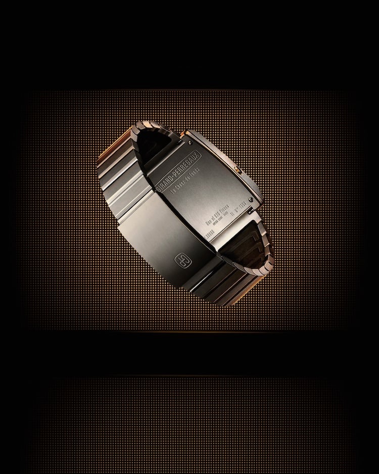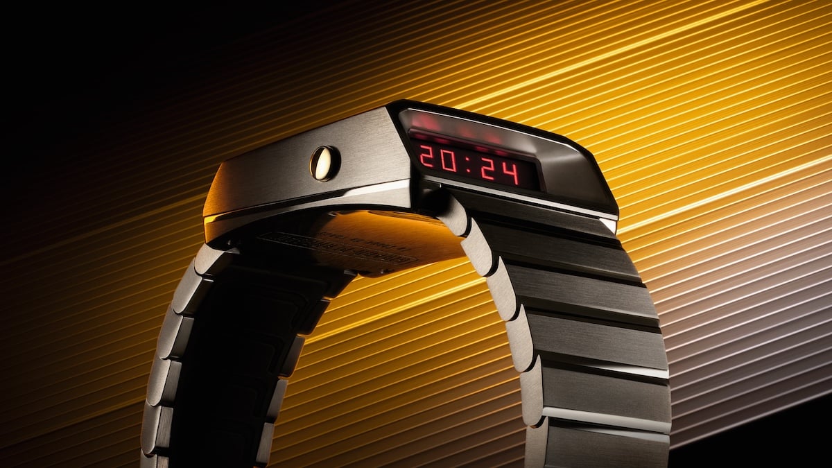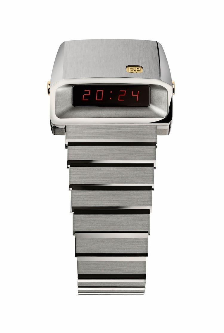 Il Casquette 2.0 si distingue per l’uso di titanio grado 5, scelto per la sua leggerezza e resistenza. La cassa dalle dimensioni di 42,40 x 33,60 mm e uno spessore di 14,64 mm conferisce all’orologio un aspetto robusto e deciso. A impreziosire il design, il logo GP e i pulsanti in oro giallo 2N 18 carati, un tributo alle versioni placcate oro degli anni ’70. Il display a Led tubolare, protetto da vetro zaffiro, ripropone un’estetica vintage, conferendo all’orologio un’identità unica e fortemente riconoscibile.