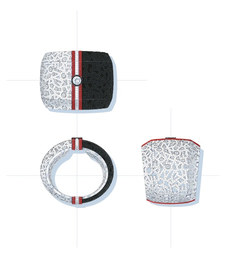 L’accostamento di materiali pregiati e materiali high-tech è una firma della collezione: particolarmente leggero e resistente, l’alluminio accetta nuovi colori, mentre la fibra di carbonio, combinando bassa densità ed alta resistenza, permette di realizzare un polsino sportivo ultraleggero. La laccatura amplia la tavolozza cromatica con sfumature che si abbinano idealmente a quelle delle pietre preziose. Tutti i colori delle pietre preziose sono rappresentati in tonalità vibranti, intense e luminose, come un set di cinque zaffiri del Kashmir, frutto di una ricerca durata diversi anni, che di per sé è un’impresa. I contrasti bicolore e tricolore esaltano le pietre colorate mentre le loro forme contribuiscono sottilmente all’ergonomia dei gioielli.