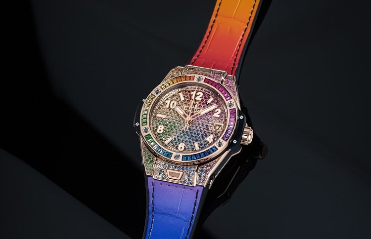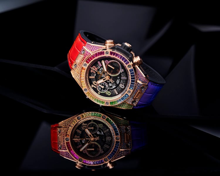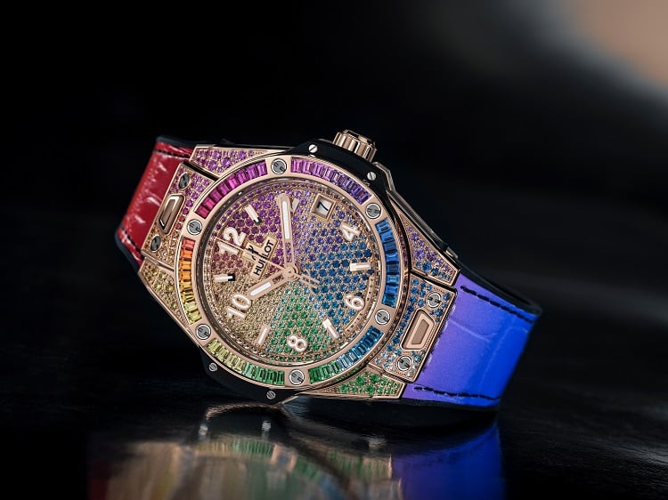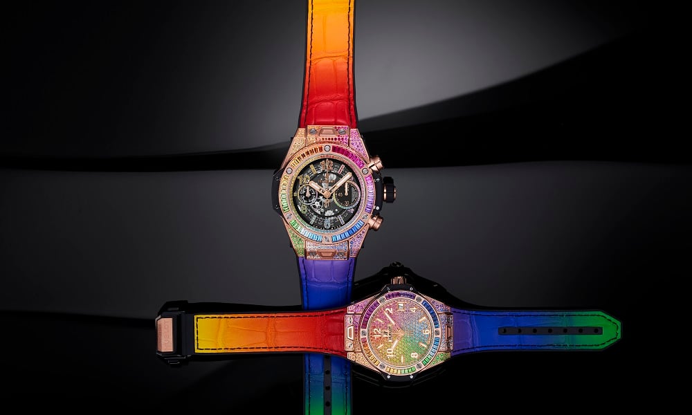 La vivacità dell’arcobaleno torna anche nel cinturino intercambiabile, realizzato nel cosiddetto “alligatore gommato” (una fusione di caucciù naturale e alligatore) e facilmente personalizzabile grazie al sistema brevettato One Click, che permette di modificare il colore a proprio piacimento. I nuovi orologi Hublot sono disponibili rispettivamente al prezzo di 81 mila euro per Big Bang One Click Rainbow da 39 mm e 90.300 euro per il Big Bang Unico Raimbow da 45 mm.