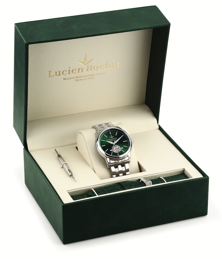 Tra le diverse versioni (braccialate o con cinturino, con cassa in acciaio o trattamento Pvd oro rosa) a spiccare è la declinazione con quadrante nella ricercata nuance verde, colore rappresentativo della marca, con il ponte che riprende il simbolo di Lucient Rochat. Sempre verde anche il cinturino addizionale in pelle stampa alligatore che si trova all’interno della raffinata box personalizzata.