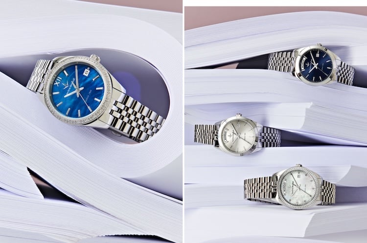 Lo stile classico guida il disegno dei quadranti dei cronografi, ricchi di dettagli ispirati agli orologi del passato: in evidenza i contatori dei 30 secondi e delle 24 ore, numeri arabi e grafica che riprende la scala tachimetrica sul rehaut. Gli orologi alternano i bracciali e i cinturini in pelle, abbinati ai dial nei colori bianco, blu, nero e verde.