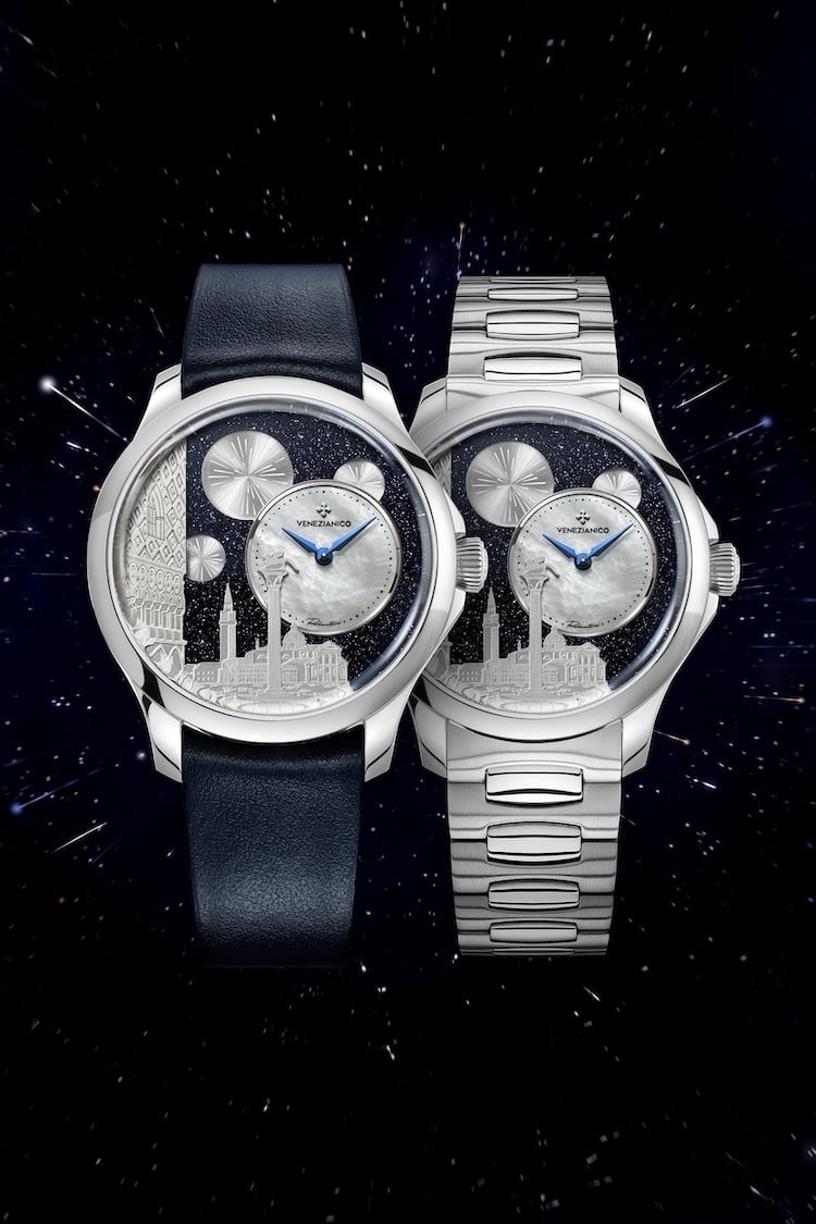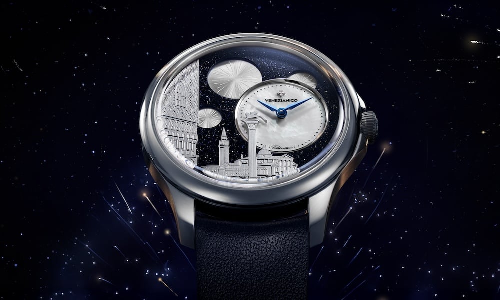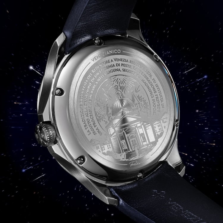 Il tempo è definito da un micro-movimento automatico, il Seiko NH05, con un diametro di soli 17,55 mm, fissato con un anello in ottone decorato con una finitura perlage. Costruzione a quattro livelli a partire da un cielo stellato realizzato in avventurina, seguito dal piccolo quadrante decentrato in madreperla che simboleggia la Luna, un disco satinato che raffigura i fuochi d’artificio, mentre sullo sfondo un bassorilievo del Palazzo Ducale e della Basilica del Redentore, entrambi rodiati. Il tutto per generare un effetto ipnotico e suggestivo con una Piazza San Marco che prende vita nella notte, con la maestosa Basilica del Redentore che si staglia sullo sfondo e il Palazzo Ducale sulla sinistra mentre al centro della scena e il leone di San Marco che si erge fiero, simbolo del potere della Serenissima. La notte stellata avvolge poi il tutto, offrendo una cornice magica per i fuochi d’artificio che ne illuminano il cielo, creando un’atmosfera di festa e gioia.