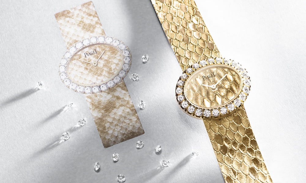 Come già avvenuto nel 2018, l’oro si conferma infatti il grande protagonista della nuova collezione Piaget, unito alla passione per la natura che caratterizza il segnatempo Extremely Lady in oro rosa testurizzato, in modo da ricreare gli effetti di luce ed ombre creati dalle squame di un serpente. Attraverso un nuovo processo di lavorazione, ciascuna squama viene satinata a mano con un’infinità di piccolissime differenze di angoli e pressione. Questa lavorazione è presente sia sul quadrante sia sul bracciale: una caratteristica estetica comune nei modelli Piaget degli anni ‘60 e ‘70.
