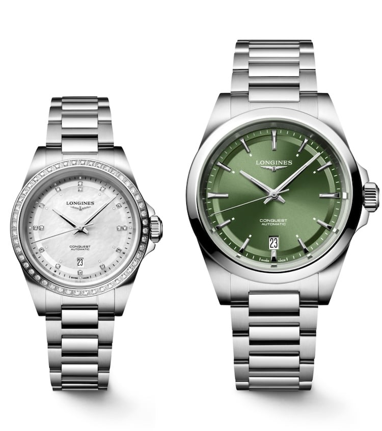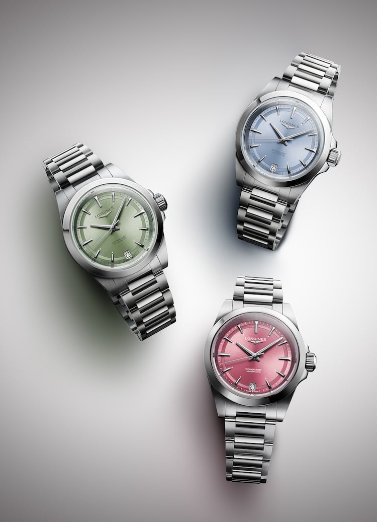 Protagoniste della nuova campagna “A life in a day”, con le ambasciatrici dell’eleganza Zhao Liying, Suzy e Barbara Palvin, i Conquest con cassa da 34 mm sono proposti con quadrante verde, rosa o azzurro con finitura esterna azzurrata.