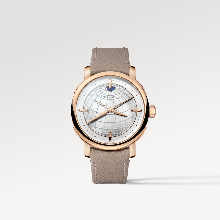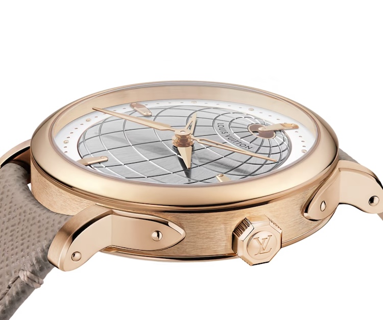 La cassa dell’Escale Twin Zone misura 41 mm ed è proposta in oro rosa. Le anse, elemento distintivo della collezione, richiamano le staffe e gli angoli metallici dei bauli Louis Vuitton, non come citazione decorativa ma come parte strutturale del disegno. L’impermeabilità è garantita fino a 50 metri.