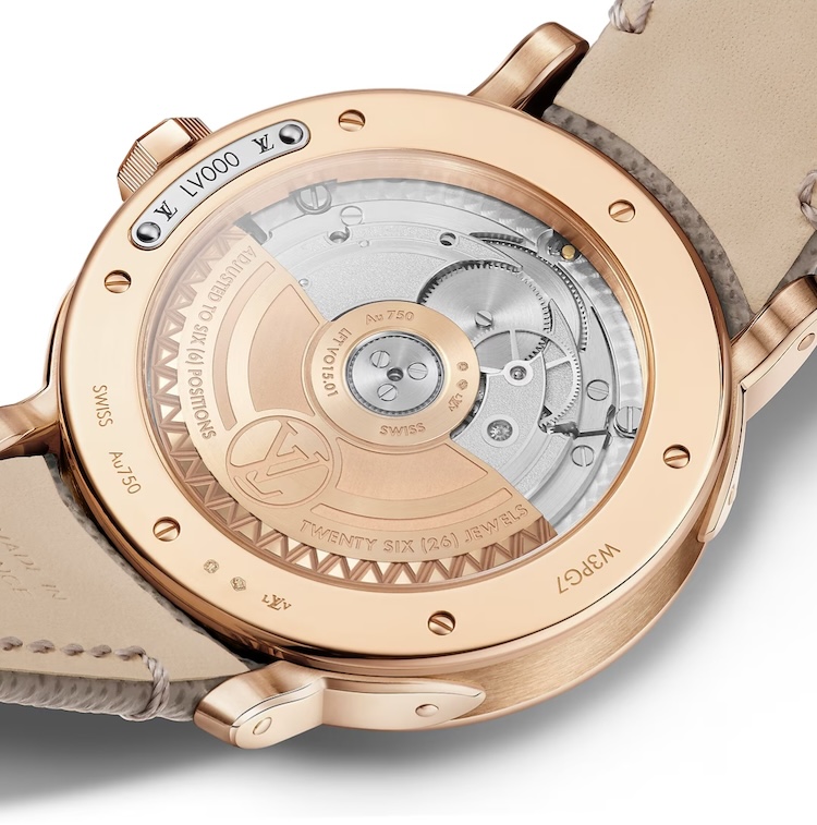 A rendere possibile questa architettura è il calibro automatico di manifattura LFT VO 15.01, sviluppato all’interno di La Fabrique du Temps Louis Vuitton. Il movimento è stato progettato specificamente per gestire la complessità di quattro lancette coassiali e di regolazioni al minuto, senza compromettere la fluidità d’uso né la leggibilità del quadrante.