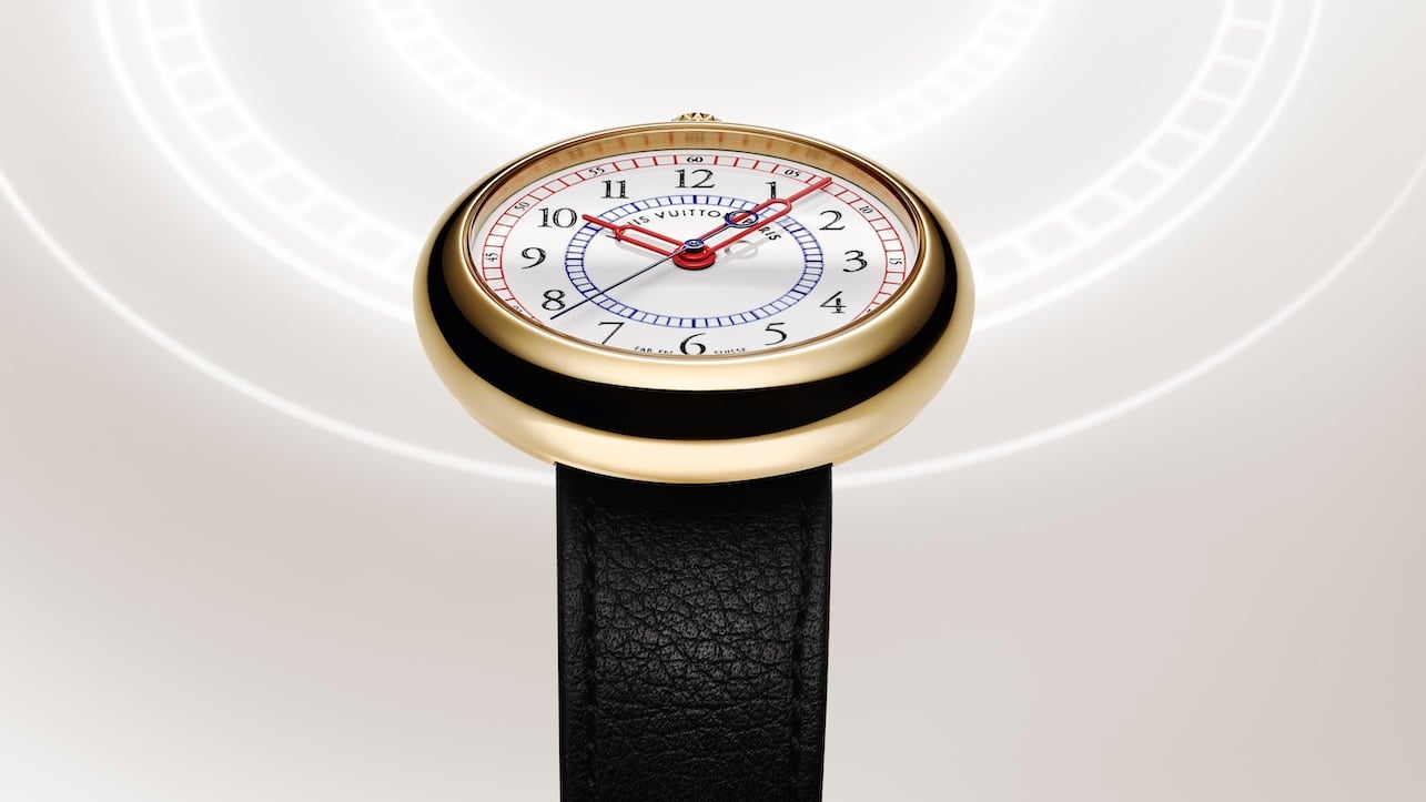 Il nuovo Louis Vuitton Monterey recupera quella filosofia e la traduce in un oggetto da indossare. La cassa “a ciottolo” in oro giallo 18 carati, di 39 millimetri di diametro, mantiene il profilo continuo e levigato dell’originale. Ogni superficie è curva, come modellata dalla luce.