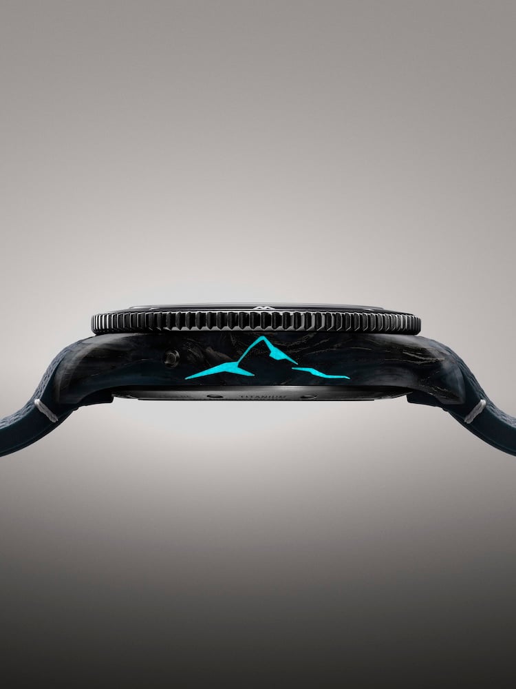 Sul lato sinistro della cassa, nascosto alla vista ma ben visibile per chi indossa l’orologio, si trova il profilo del Monte Vinson con emissione luminosa: bianco di giorno e blu acceso di notte. La lunetta girevole bidirezionale è in titanio, con inserto in alluminio anodizzato grigio chiaro e punti cardinali in Superluminova blu.