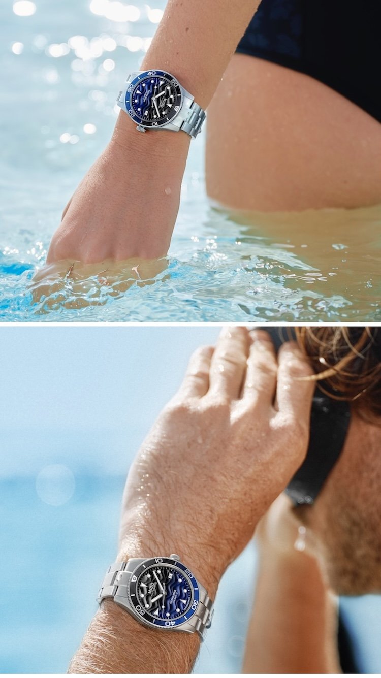 A fare da sfondo al preciso scorrere delle lancette di ore e minuti – ricoperte con Superluminova bianca, come i generosi indici rotondi, per offrire una perfetta leggibilità sia di giorno che al buio – un caratteristico quadrante in rilievo, unico e distintivo, che evoca il movimento delle correnti sulla sabbia. Le sue sfumature vanno dal nero al blu navy, colori ripresi dalla lunetta girevole unidirezionale con anello in alluminio high-tech con punto bianco luminescente per segnare l’inizio della graduazione e misurare correttamente i tempi di immersione.