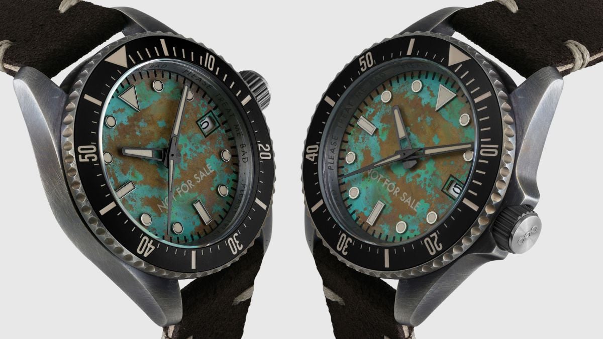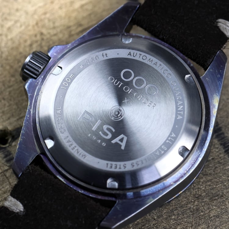 Il modello creato per questa iniziativa porta la firma inconfondibile di OOO – Out of Order, marchio veneto noto per la sua estetica “rovinata di fabbrica”. La cassa in acciaio inox 316L da 40 mm è sottoposta al trattamento di invecchiamento brevettato dal brand, mentre il quadrante in ruggine stabilizzata – un’altra esclusività del marchio – ospita indici riempiti di Superluminova C3.