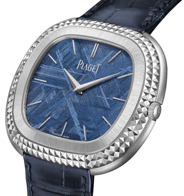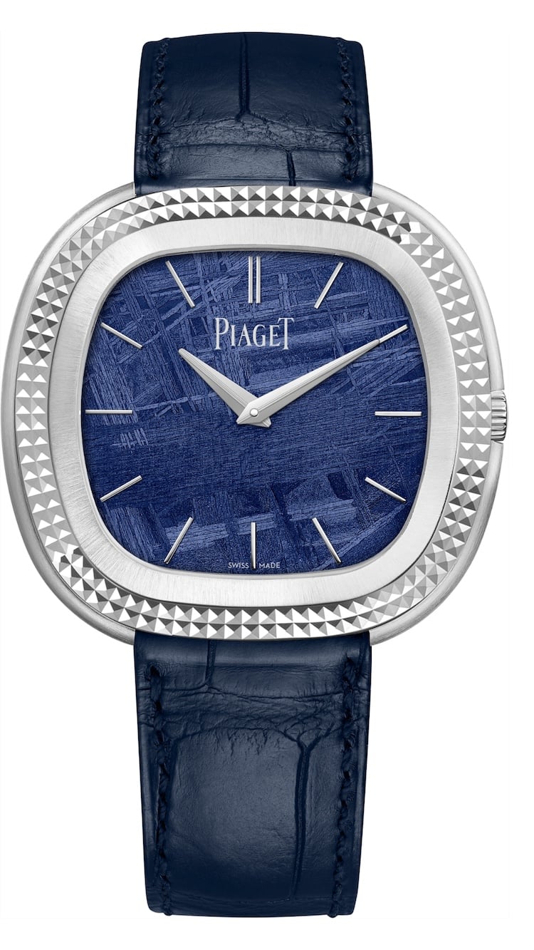 In evidenza, la finitura Clou de Paris, realizzata con meticolosa precisione sugli elementi curvi della cassa da 45mm in oro bianco, un processo che ha richiesto dieci mesi di lavoro per raggiungere la perfezione. Questo orologio si arricchisce di un quadrante in meteorite blu, scelta che valorizza l’estetica unica del pezzo e omaggia l’uso pionieristico delle pietre da parte della maison. Lancette dauphine e indici eleganti completano il quadro, richiamando un’eleganza vintage.