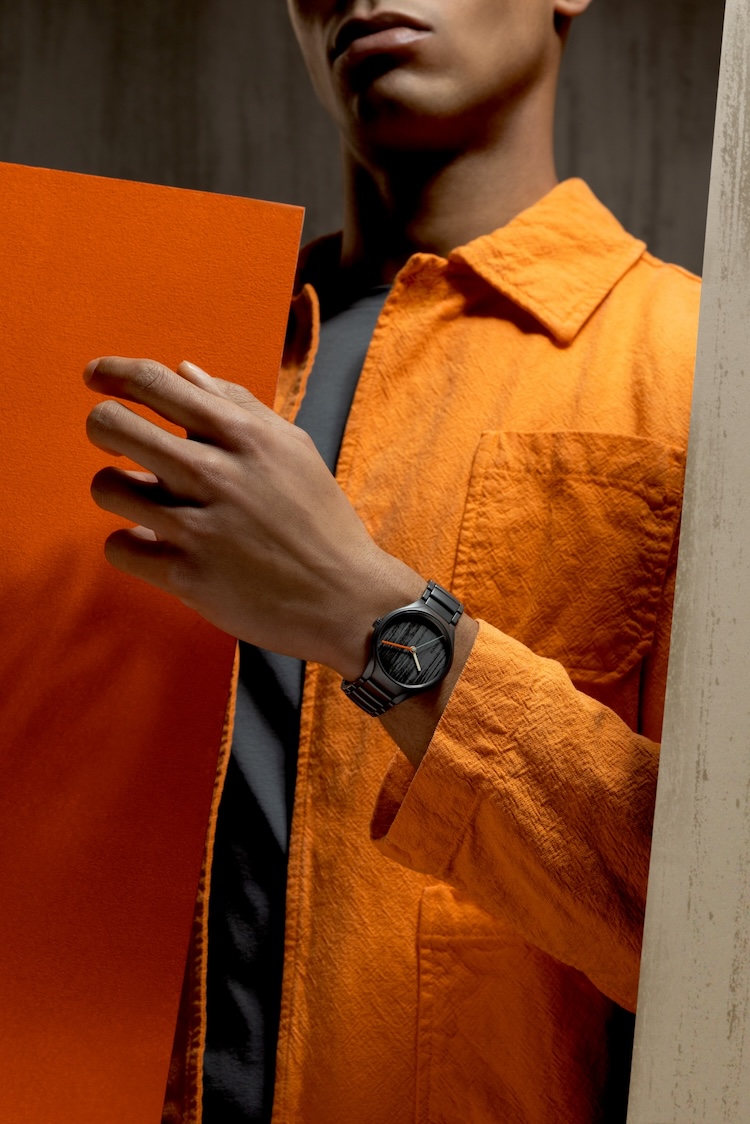 Le lancette laccate in Powerful Orange, Emerald Green e Olive Green introducono accenti cromatici su una base più scura. Le proporzioni restano identiche alle altre due varianti, mantenendo coerenza di design all’interno della collezione.