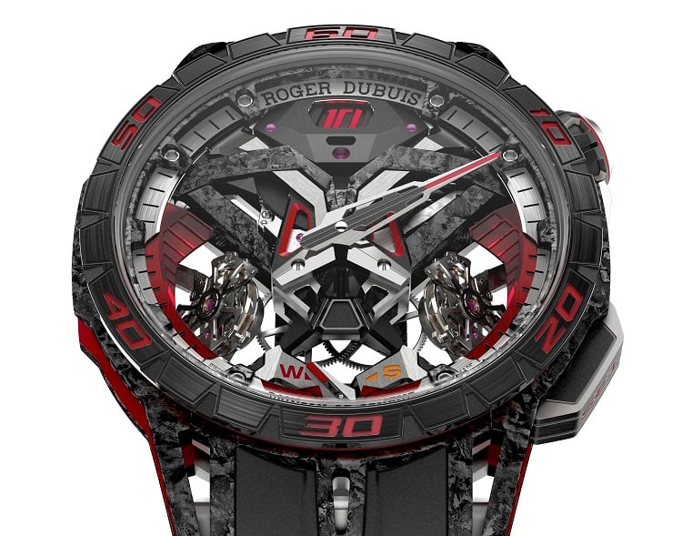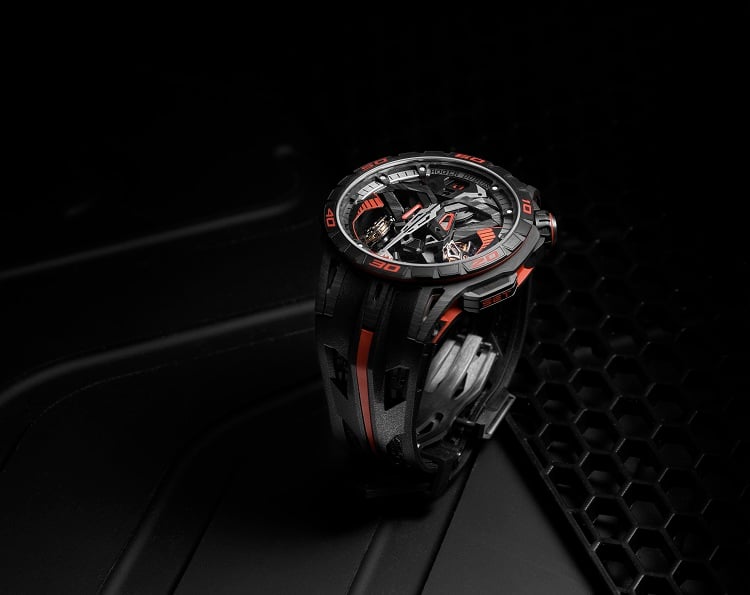 Tra le tante novità presentate nel corso del Sihh 2019 di Ginevra, a ritagliarsi un posto speciale sono stati gli orologi sportivi, ormai veri e propri oggetti di culto per gli appassionati di lancette. A spiccare, l’Excalibur One-off presentato da Roger Dubuis, nato dalla collaborazione con i partner Lamborghini Squadra Corse e Pirelli. Un modello che rende omaggio alla supercar Lamborghini SC18 Alston, la prima mai creata dall’azienda italiana esclusivamente per la guida su circuito. I richiami al mondo delle quattro ruote sono subito evidenti: il design e i colori dell’orologio sono ispirati agli interni della vettura, mentre il cinturino presenta il simbolo della “L” tipico delle gomme Pirelli montate su tutte le auto della casa di Sant’Agata Bolognese ed è realizzato con la stessa struttura in fibre di nylon che ha reso celebri i pneumatici dell’azienda. La cassa da 47 mm dell’Excalibur One-off presenta inoltre all’interno della sua struttura carbonio Smc e una carrure in tessuto di fibra di carbonio, materiale che Lamborghini Squadra Corse ha utilizzato in molte delle sue auto di punta.La ceramica, solitamente utilizzata per i freni dei veicoli, è qui impiegata in versione nera sulla lunetta e in rosso lacca per gli indici dei minuti.