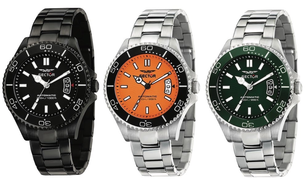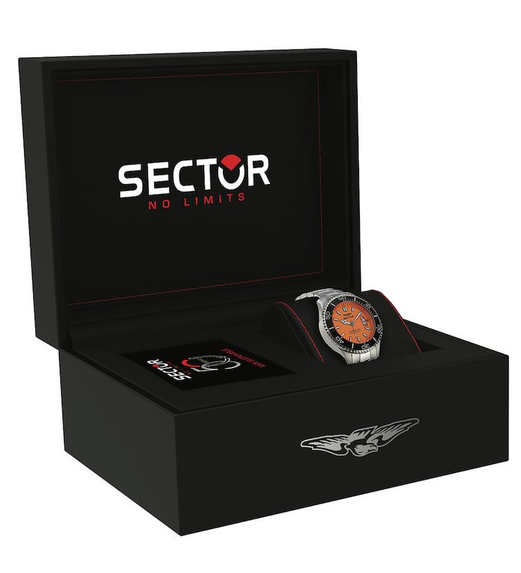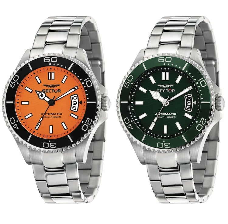 La lunetta girevole unidirezionale in alluminio incornicia un quadrante con pattern con motivo a onda in rilievo forest green opaco o arancione opaco, colore che richiama alcuni orologi iconici della storia di Sector. Entrambi hanno un prezzo di 349 euro.