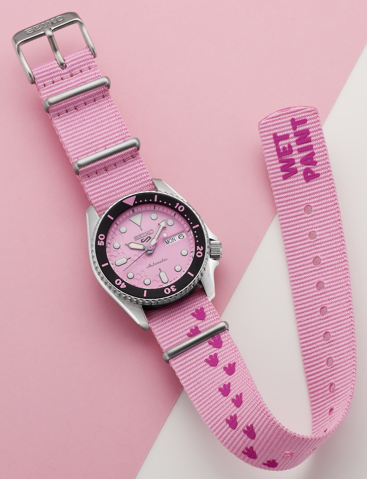 Oltre al bracciale in acciaio, l’orologio viene fornito con un secondo cinturino intercambiabile in nylon rosa, decorato con impronte tono su tono e la scritta “WET PAINT”, ripresa direttamente dal cortometraggio originale. La stessa tipografia viene utilizzata sulla lunetta, creando una coerenza grafica che attraversa tutti i livelli del progetto.