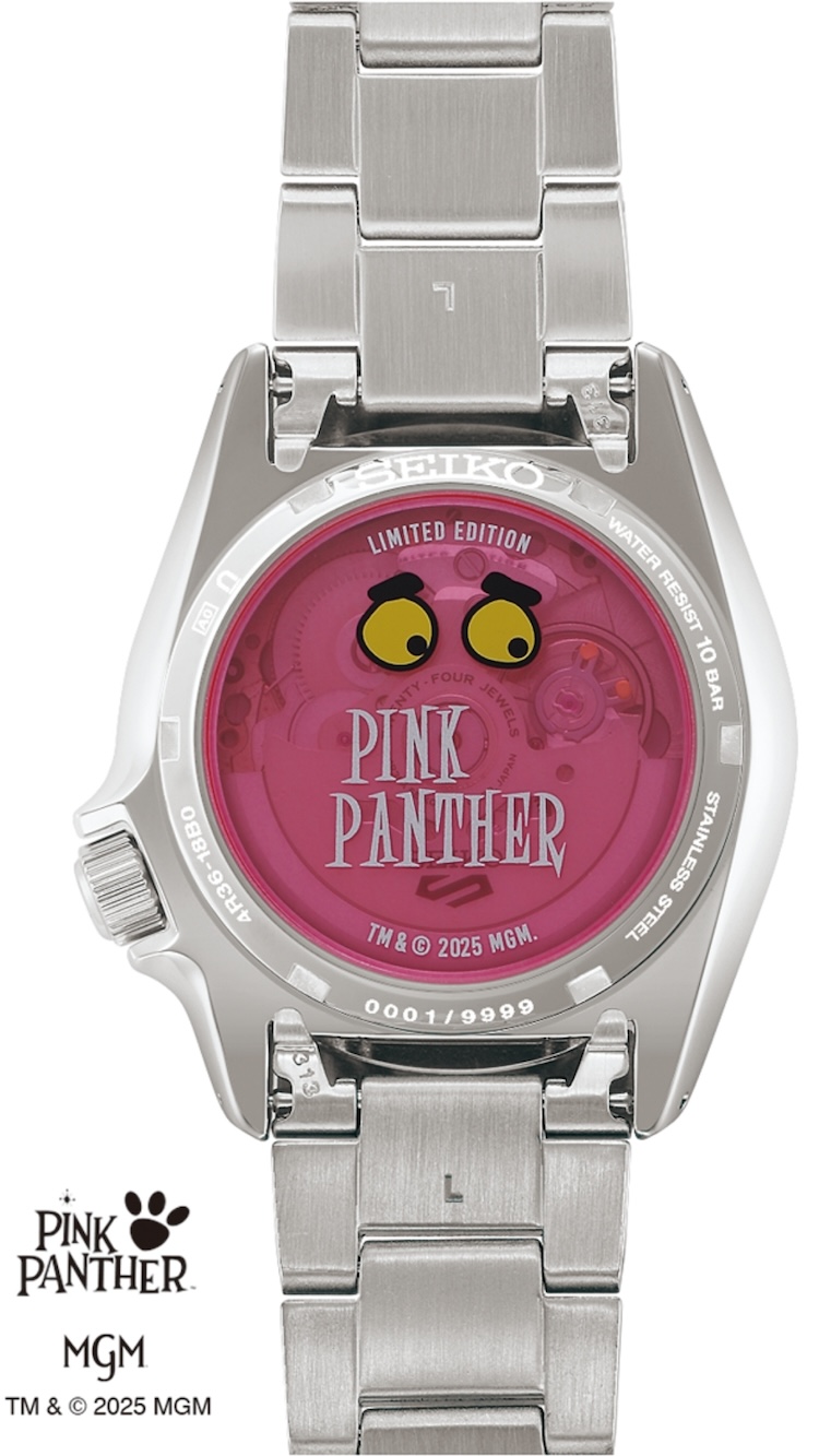 Sul retro, il fondello a vite trasparente – caratterizzato da un vetro rosa – prosegue la narrazione visiva con la raffigurazione della Pantera Rosa mimetizzata su un muro dipinto. Sono presenti la dicitura “Limited Edition” e il numero di serie individuale, a sottolineare una produzione limitata a 9.999 esemplari.