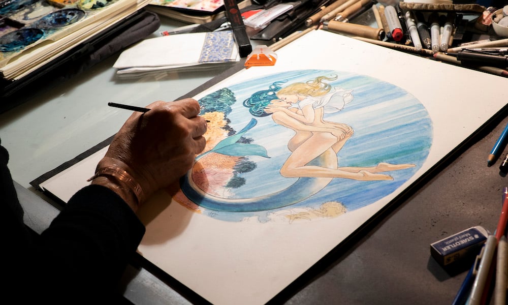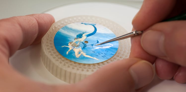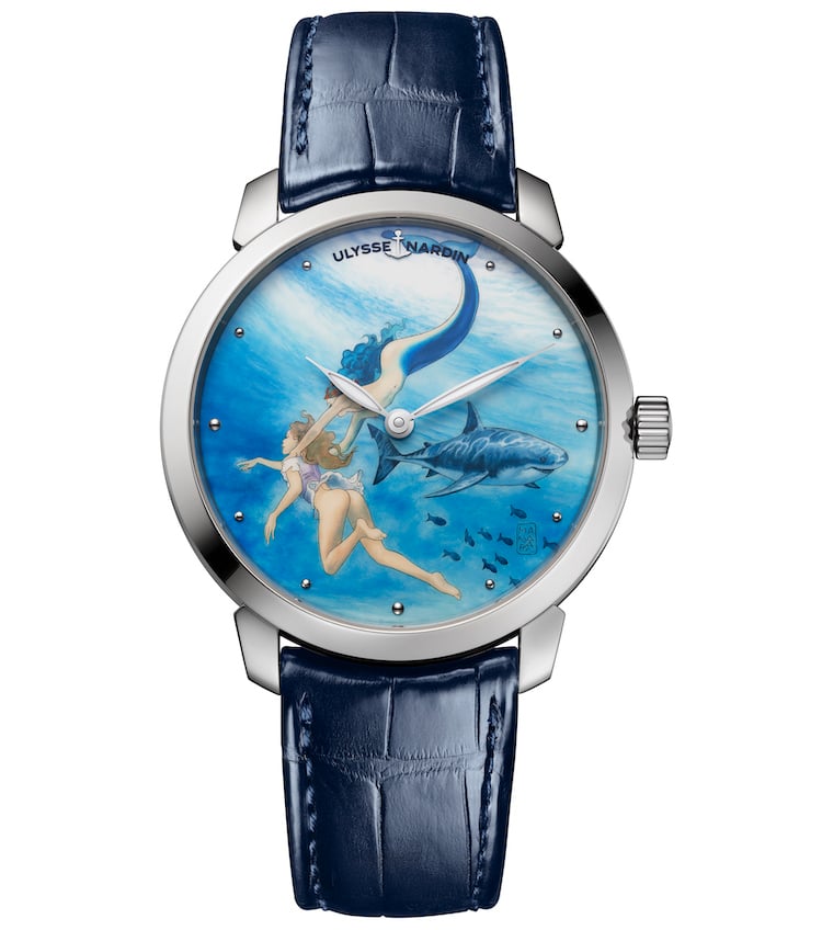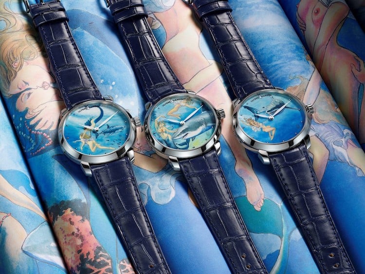 Nonostante qualcuno ancora se ne scandalizzi (e a Ginevra lue reazioni sono state le più disparate: dall’ammirazione, all’ironia, fino a una sorta di puritano distacco) l’orologeria erotica è parte integrante della storia del mondo delle lancette. Un libro nel quale, anno dopo anno, Ulysse Nardin scrive nuovi, intriganti capitoli. Quello di quest’anno è composto da i modelli Classico Manara, da dieci diverse fantasie, declinate su altrettanti orologi in acciaio e in oro rosa, per una serie limitata di 200 pezzi totali. A realizzarli, il maestro del disegno erotico Milo Manara: “l’orologio – precisa – si presta in modo particolarmente adatto a questo tema perché l’erotismo è eterno”.Le dieci scene riportate sui quadranti raccontano la storia saffica sotto le onde fra una donna e una sirena ultraterrena. “Dovevo pensare ad un tema – spiega Manara dal suo studio in Italia, in Valpolicella  che riunisse tutte queste dieci immagini insieme e che tuttavia lasciasse ad ognuna la sua autonomia, così che funzionasse da sola senza l’aiuto delle altre. Non è una storia lineare ma c’è un tratto comune che si basa su due personaggi, una donna eterna e una sirena”.La serie di illustrazioni create da Manara è stata poi riprodotta dagli artigiani di Ulysse Nardin, nella manifattura di Le Locle, grazie all’utilizzo della tecnica della micropittura. Circa 50 le ore necessarie per miniaturizzare i disegni sui quadranti, una superficie che è circa 10 volte più piccola dei disegni originali fatti con acquerelli. Da notare, la grande attenzione a dettagli come il blu profondo del mare con le sue onde, ma anche il  colore delle labbra e dei gioielli della sirena: tutto è stato dipinto a mano usando un pennello con le dimensioni di una singola ciglia. Per enfatizzare le scene erotiche di Manara, è stata applicate una lacca come rivestimento alla pittura acrilica.