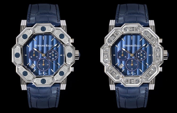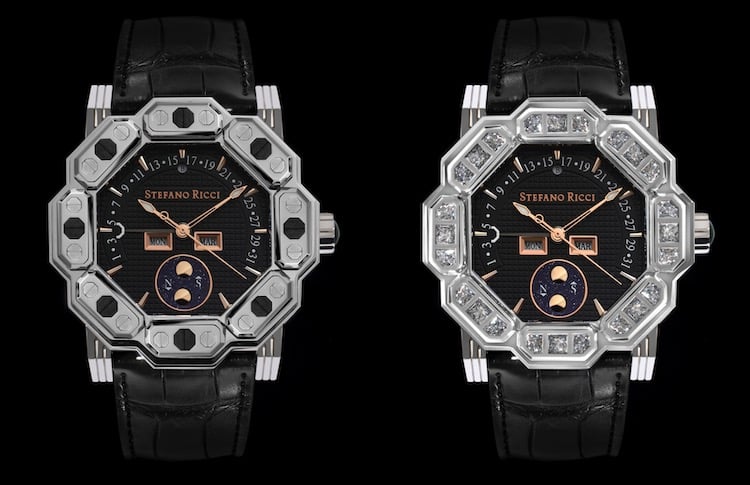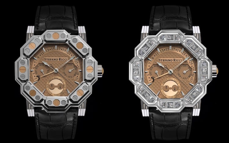 sempre stata per me fonte d’ispirazione. Le sue geometrie, le architetture e le arti trasmettono un senso di equilibrio incorruttibile davanti allo scorrere del tempo”.A caratterizzare il nuovo Octagon è la struttura con due vertici allineati, ottenuti dalla sovrapposizione di due quadrati di cui uno ruotato di 45° rispetto all’altro: “Nel disegnare il mio orologio – ha aggiunto Ricci – ho immaginato otto maglie di una catena importante che avvolgono, in una simmetria di raggi ad asse verticale, le espressioni del tempo, il suo calendario o la sua misura”. Il segnatempo è realizzato in tre modelli, ognuno in edizione limitata a soli 10 esemplari e tutti con cassa ottagonale in oro bianco da 45 mm di diametro. La corona, chiusa a pressione, è segnata da incisioni in cabochon zaffiro nella versione Cronografo, onice per il Calendario Perpetuo e citrino nel caso del Calendario Annuale. Tutte e tre le versioni sono inoltre proposte anche in una declinazione più preziosa con diamanti, sempre in serie limitata a 10 pezzi ciascuna.