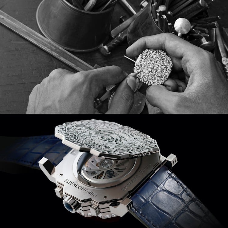 Accompagnati da cinturino in coccodrillo cucito a mano, con chiusura déployante in oro bianco dalla fibbia ottagonale con viti a intaglio radiale, i tre orologi presentano una cuvette incernierata sul fondello realizzata con la tecnica detta inglesina, ispirata a quella utilizzata per decorare le parti metalliche di fucili di altissimo pregio.