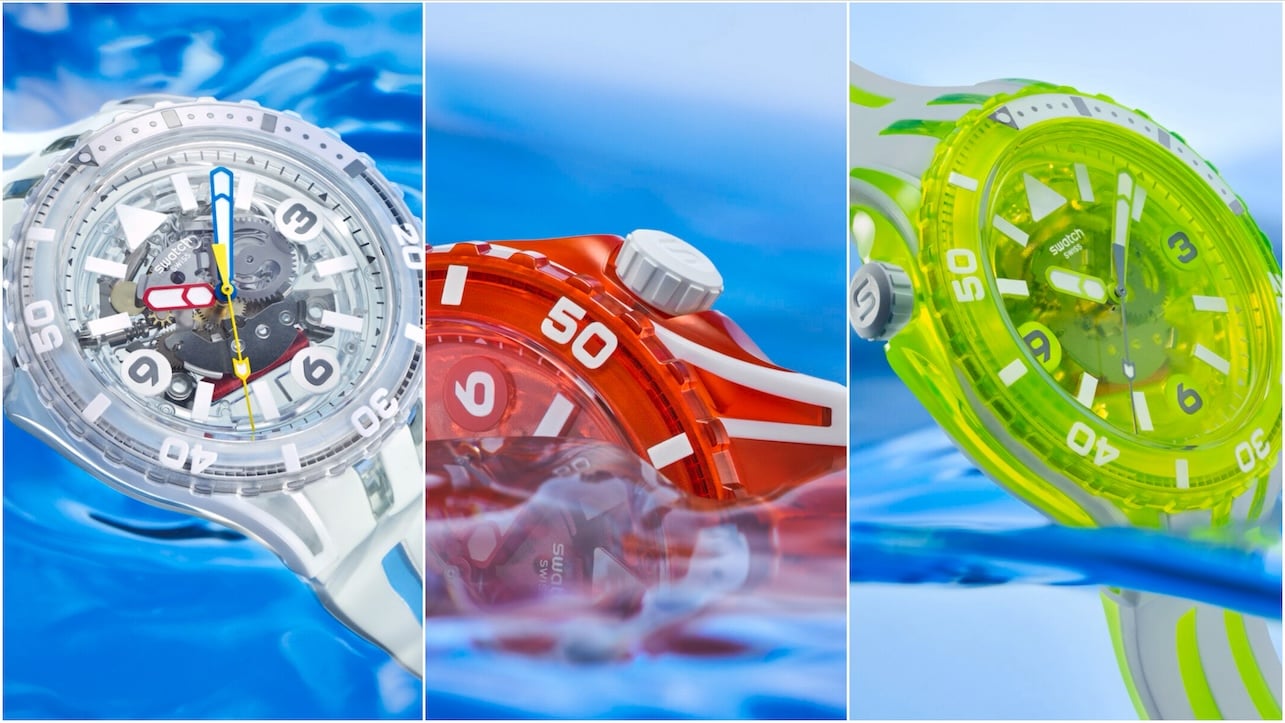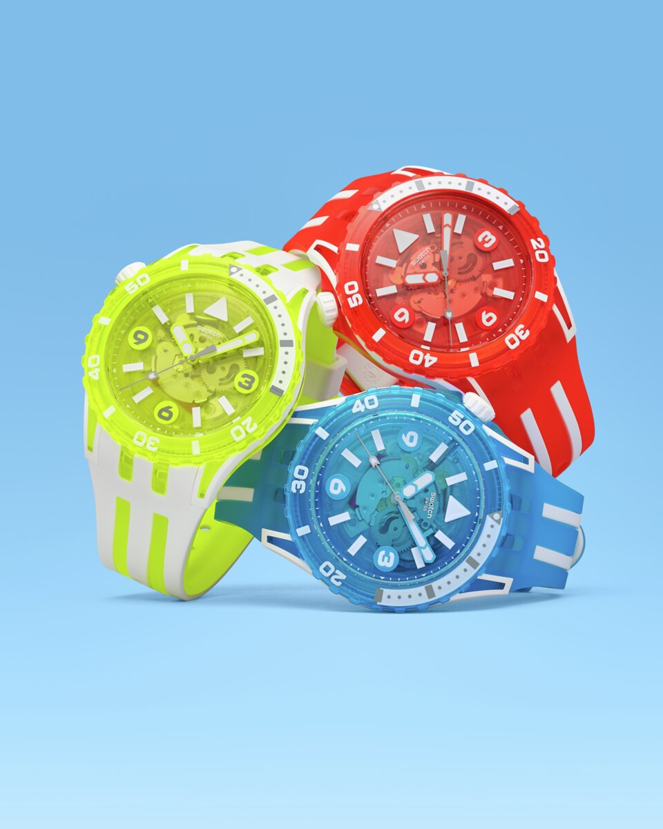Swatch presenta la collezione Scubaqua, cinque orologi subacquei ispirati alle meduse, costruiti con materiali sostenibili e trasparenze vibranti.