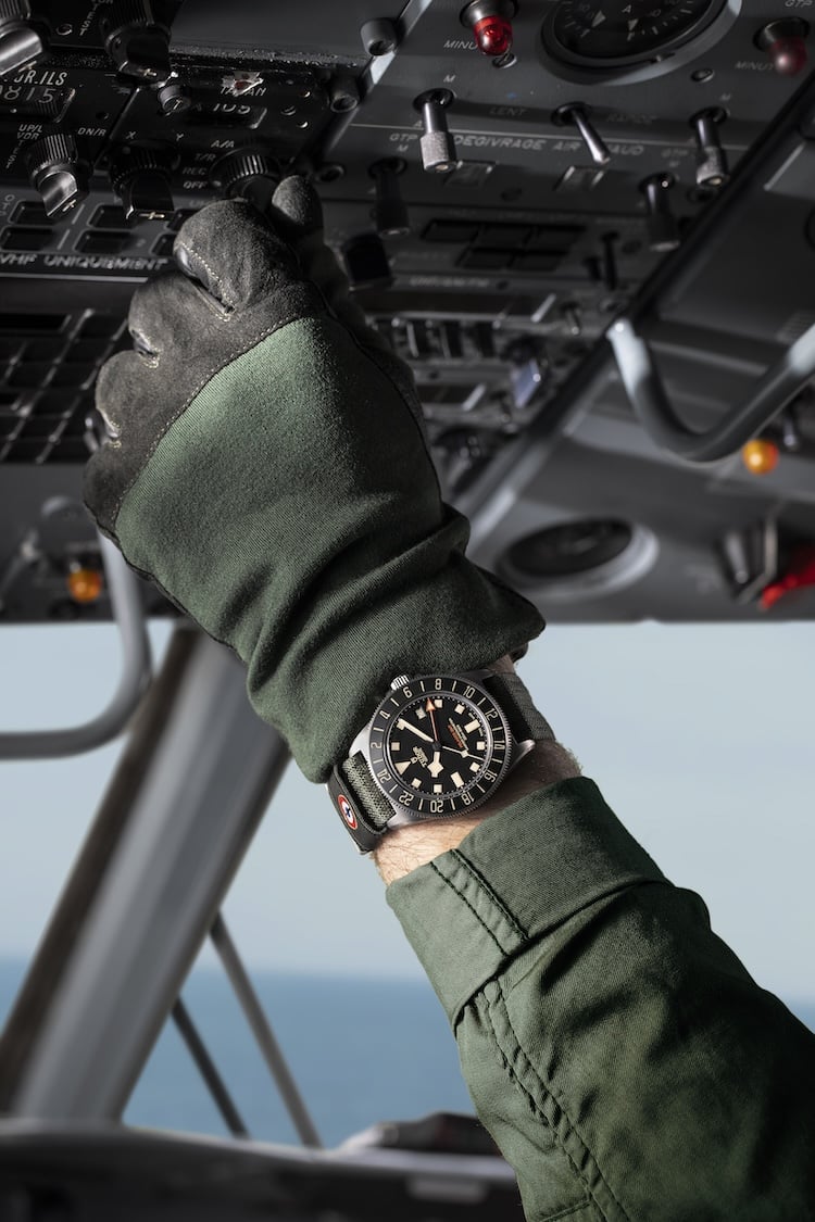 Un dettaglio particolare è il cinturino in tessuto verde, realizzato con una fibbia in titanio e un passante aggiuntivo su cui è ricamata la coccarda dell’Aéronautique navale francese. Questo cinturino, prodotto in collaborazione con la storica manifattura Julien Faure, celebra l’eredità degli aviatori francesi, unendo estetica e funzionalità in un design che ricorda le tute di volo militari.
