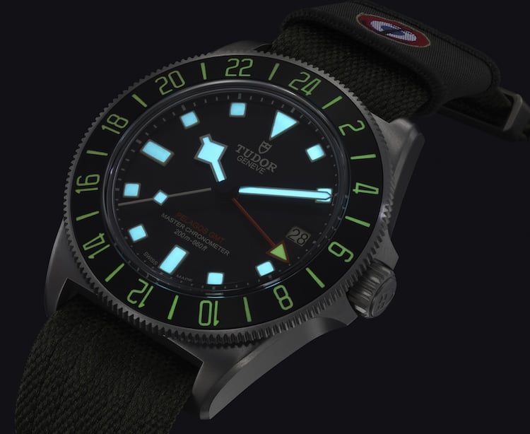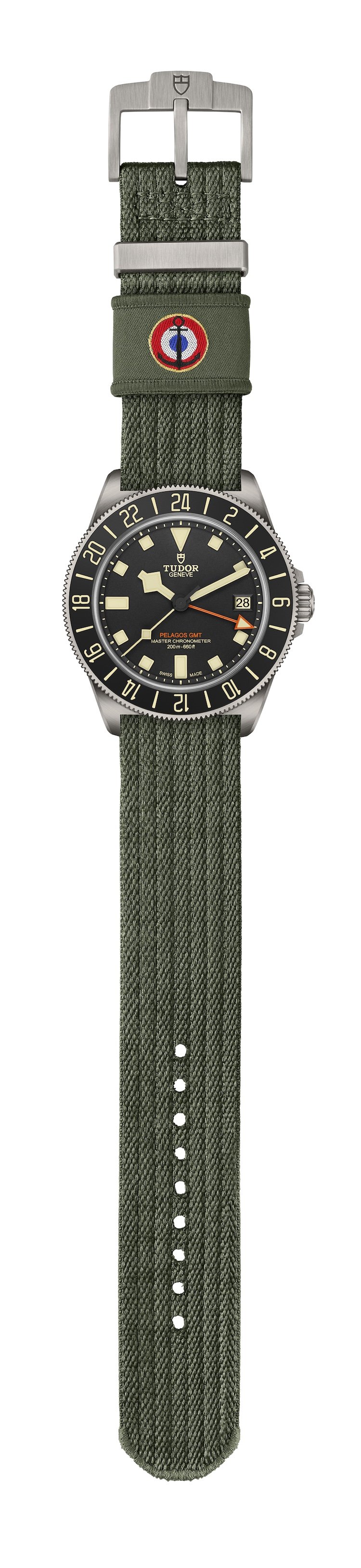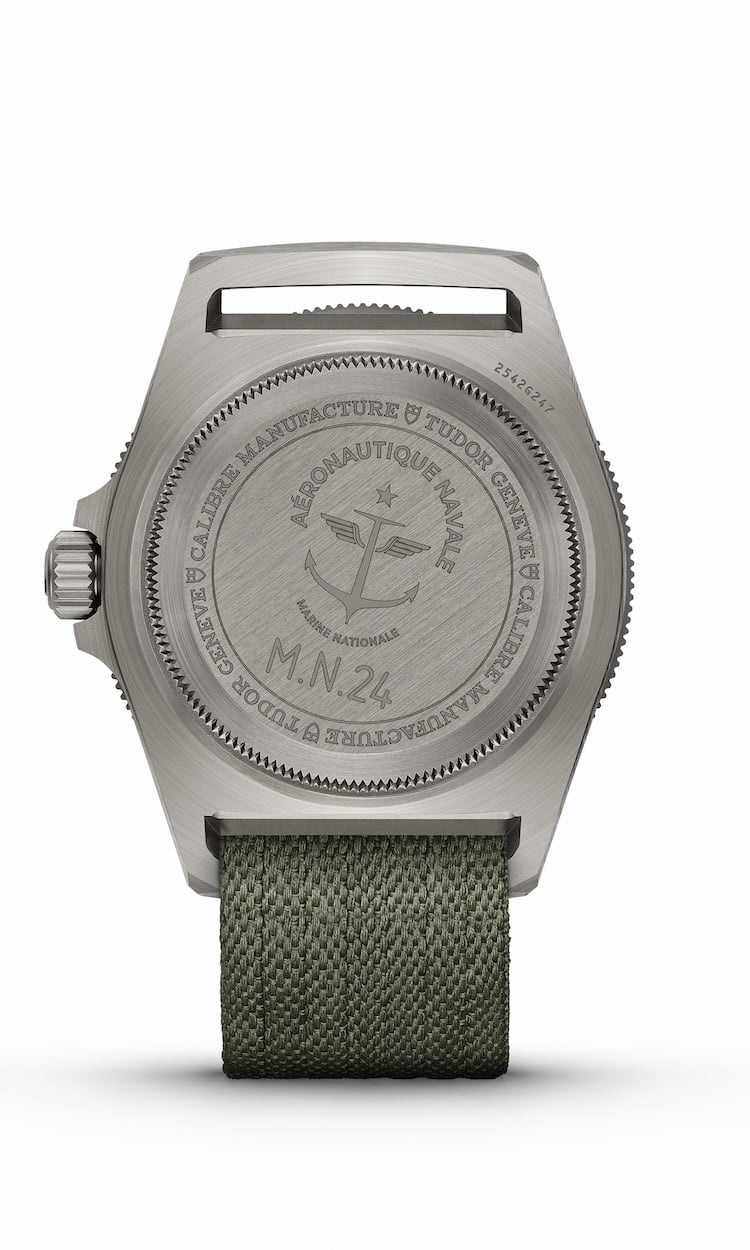 Il Tudor Pelagos Fxd Gmt Zulu Time ha un fondello in titanio grado 5 con incisi il logo dell’Aéronautique navale (Aeronautica navale francese) e l’iscrizione “M.N.24” (abbreviazione per Marine nationale 2024), un richiamo alle incisioni originali “TUDOR M.N.” degli anni ’70 e ’80.