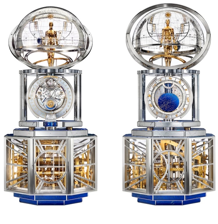 Monumentale, con un’altezza che supera il metro e un meccanismo composto da 6.293 elementi, La Quête du Temps non è soltanto un orologio ma una vera mécanique d’art. Al centro della scena si erge l’automa ‘Astronomo’, realizzato in bronzo placcato oro giallo e incastonato con 122 diamanti, programmato per eseguire 144 gesti distinti.