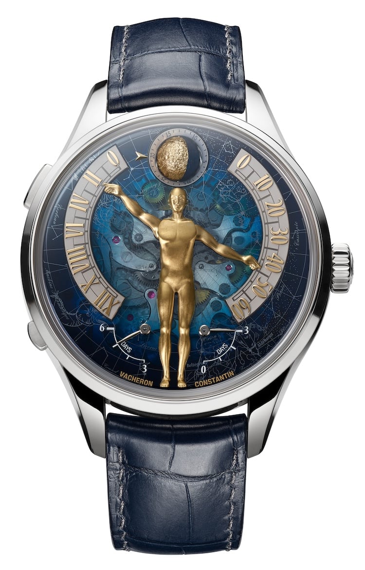Sul quadrante principale, una figura antropomorfa in titanio con trattamento dorato utilizza le braccia per indicare ore e minuti tramite doppia visualizzazione retrograda, attiva o su richiesta. Attorno a essa, la mappa stellare mostra il cielo di Ginevra del 17 settembre 1755, affiancata da indicatori della riserva di carica e fasi lunari tridimensionali con indicazione dell’età della luna. Il fondello in vetro zaffiro rivela una carta celeste che segue in tempo reale il moto delle costellazioni, con una precisione che prevede uno scarto di un solo giorno ogni 9.130 anni.