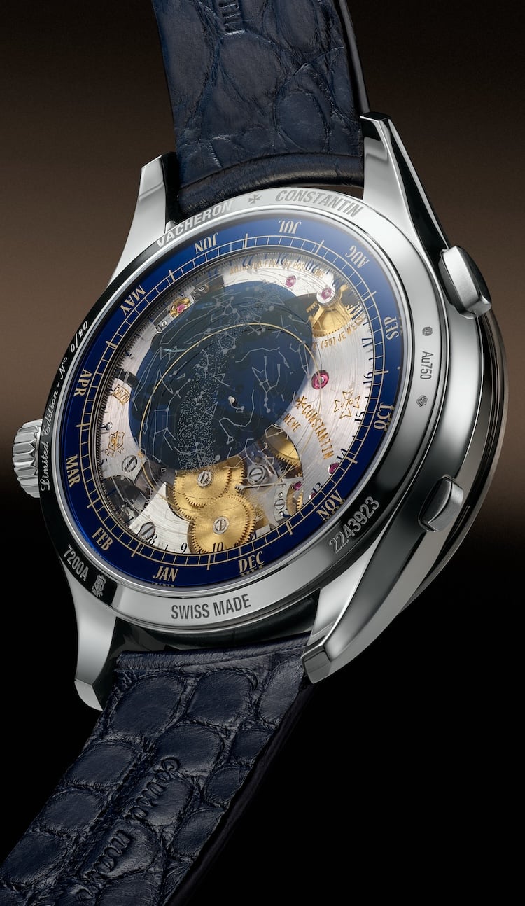 La complessità del progetto è testimoniata dalle 15 domande di brevetto depositate, sette delle quali riguardano la parte orologiera e otto il funzionamento dell’automa. A sovrastare il tutto, una cupola in vetro che raffigura le costellazioni così come apparivano a Ginevra il 17 settembre 1755, giorno della fondazione di Vacheron Constantin, quando nel cielo si allineavano anche Venere, Marte, Giove e Saturno in una rara congiunzione.
