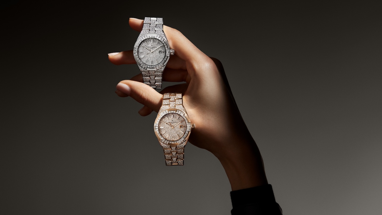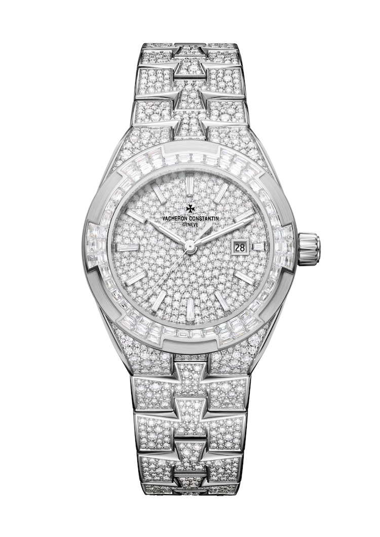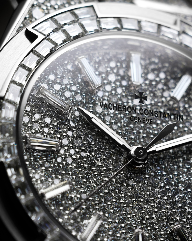 Le nuove referenze in oro bianco e oro rosa sono interamente rivestite da 1.430 diamanti per un totale di circa 12,58 carati. Lunetta, quadrante, anse e bracciale partecipano allo stesso disegno, senza gerarchie visive. La lunetta riprende il motivo a croce di Malta tipico dell’Overseas attraverso 60 diamanti taglio baguette con incastonatura invisibile, una tecnica che richiede tolleranze minime e una costruzione a binari d’oro non visibili.