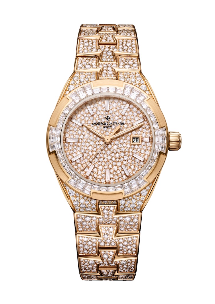 Vacheron Constantin declina l’Overseas automatico da 35 mm in due versioni di alta gioielleria, in oro bianco e oro rosa, interamente incastonate e animate dal calibro 1088/1.