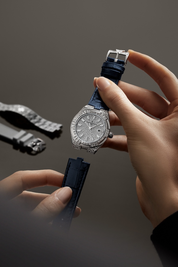 Coerentemente con lo spirito Overseas, il sistema di intercambiabilità è parte integrante del progetto: oltre al bracciale in oro con diamanti, ogni orologio è fornito con due cinturini aggiuntivi, uno in pelle di alligatore lucida e uno in caucciù bianco, abbinati cromaticamente alla versione di cassa. Anche la fibbia ad ardiglione, anch’essa incastonata con diamanti, è intercambiabile senza l’uso di strumenti, così come il sistema “easy-fit” consente una microregolazione invisibile del bracciale.