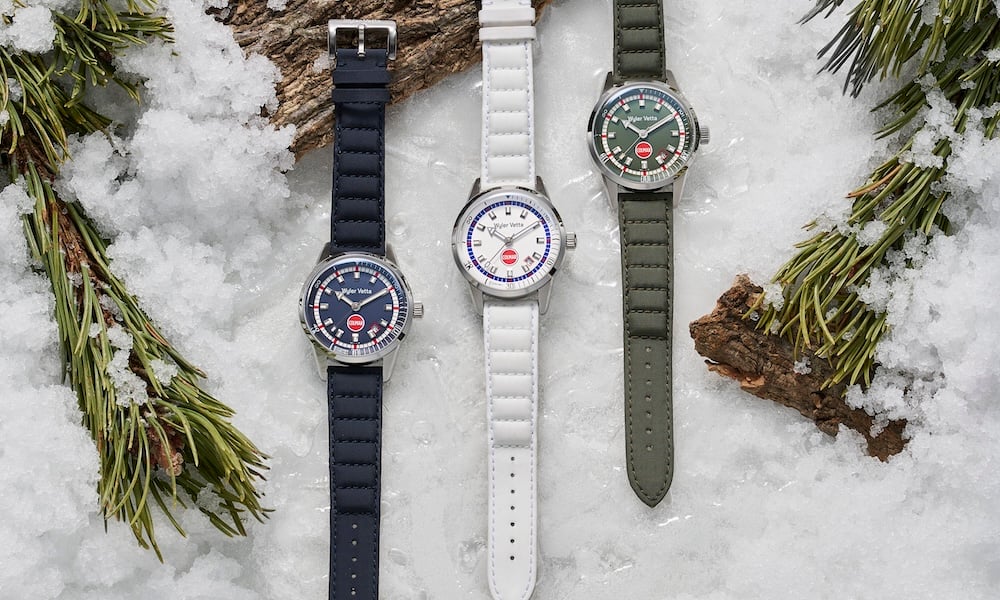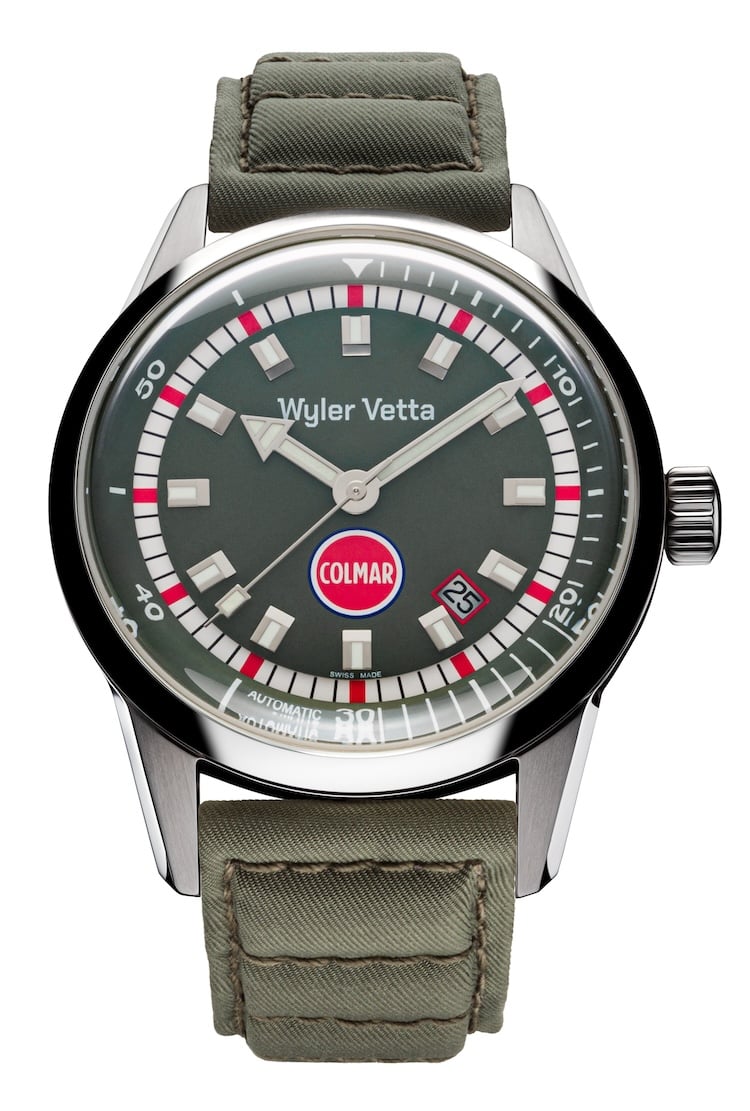 La funzione data è esposta attraverso una finestrella collocata tra le ore 7 e 8. Tutti gli orologi sono dotati di un vetro zaffiro antiriflesso bombato, un aspetto tecnico e di design al contempo, che valorizza l’ispirazione vintage del modello. Ogni orologio Jumbostar solo tempo Wyler Vetta & Colmar monta cinturini di tessuto tecnico Colmar con cuciture “effetto piumino”: si tratta di un taffetà di poliestere dall’aspetto lucente e setoso con trattamento idrorepellente e ottima resa dei colori. Il tessuto è accoppiato con la pelle. I cinturini montano una fibbia ad ardiglione in acciaio con logo Wyler Vetta inciso. Le casse, con corona a vite, sono serrate da un fondello a vite con una decorazione speciale che celebra la collaborazione Colmar e Wyler Vetta: il logo Wyler Vetta e Colmar sono affiancati dalla sagoma incisa al laser del celebre sciatore Zeno Colò, il primo atleta italiano a vincere la discesa libera ai mondiali nel 1952.