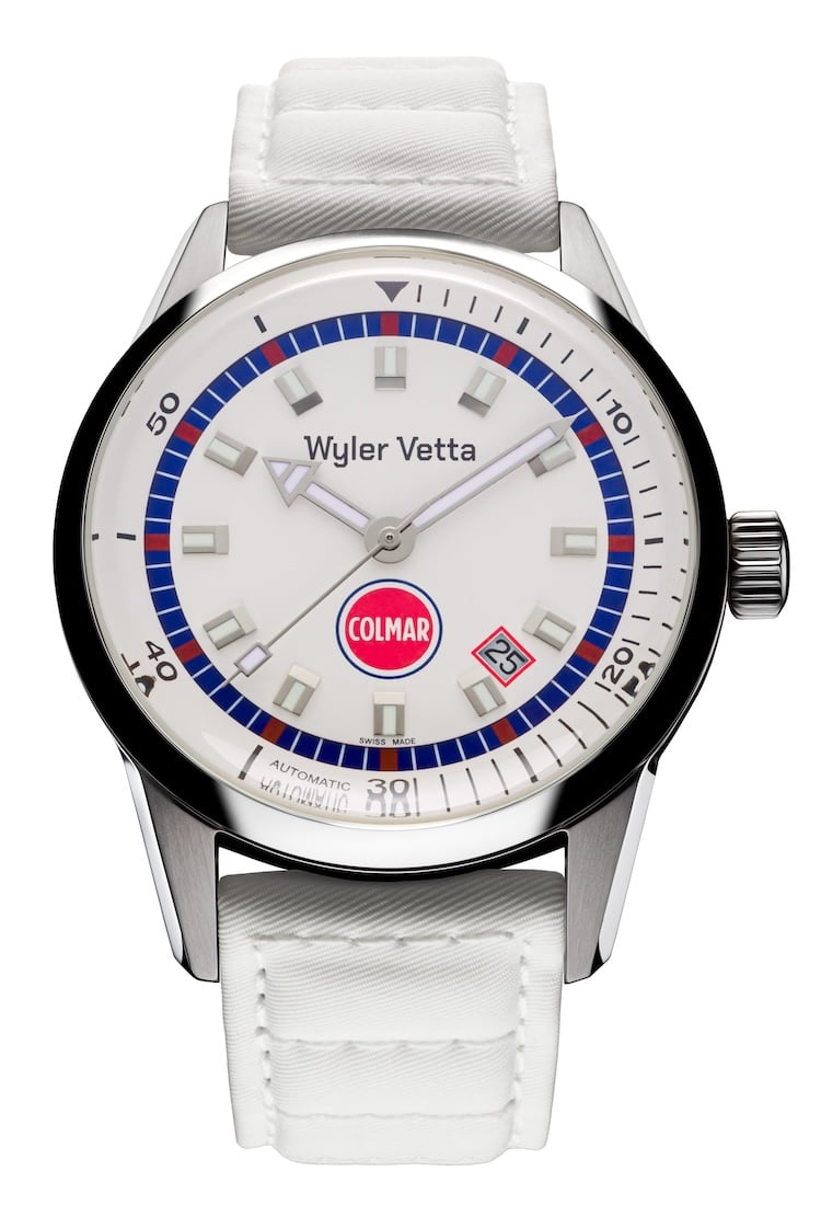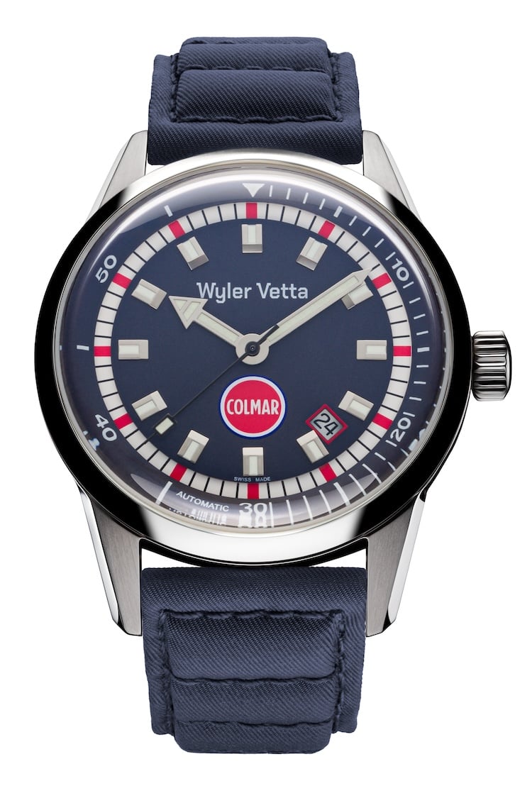 Due aziende pioniere nei rispettivi ambiti, sin dai primi passi, dall’animo fortemente italiano. Che si incontrano ora per dar vita a un orologio speciale. Nasce così il Jumbostar Wyler Vetta & Colmar, inedita creazione della collezione Jumbostar solo tempo da 41 mm, che monta cinturini realizzati con tessuto tecnico Colmar con lavorazione “effetto piumino”, declinati nei toni iconici del brand di abbigliamento sportivo: blu, bianco e verde.