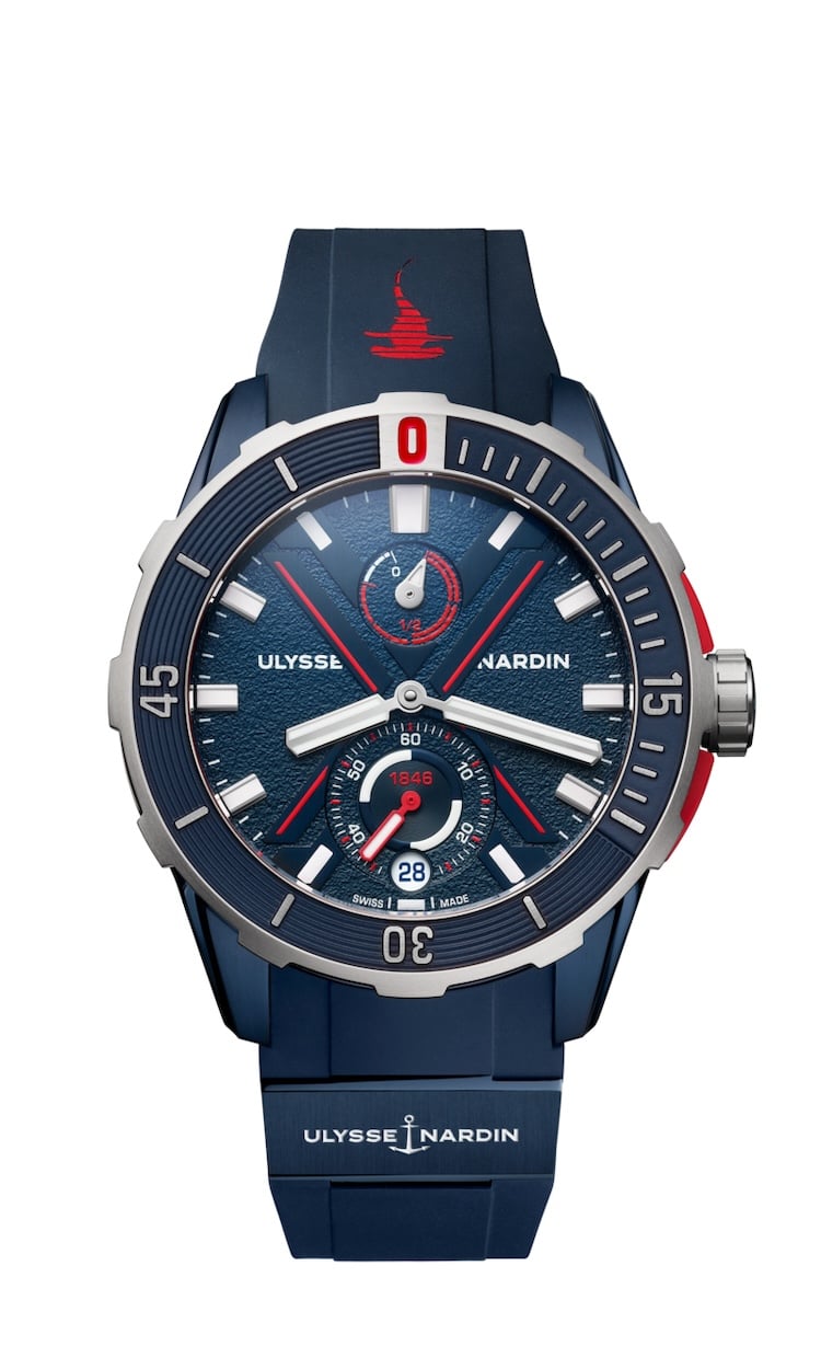 Il Diver Hammerhead Shark si distingue a prima vista per la sua cassa in titanio da 44 mm rivestita in PVD blu: un materiale leggero, anallergico e resistente alla corrosione, ideale per un orologio subacqueo. Il quadrante blu sabbiato è attraversato da una “X” in rosso e blu, segno distintivo Ulysse Nardin e dichiarazione di intenti: questo modello vuole distinguersi, anche graficamente.