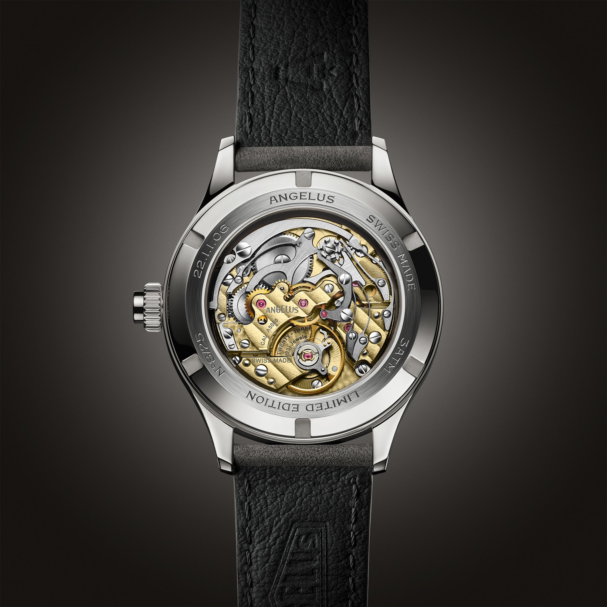 Con questo modello, parte della collezione “La Fabrique”, Angelus prosegue il lavoro di reinterpretazione dei suoi codici storici avviato con l’Instrument de Vitesse e il Chronographe Médical. In questo caso, il protagonista è un cronografo monopulsante con scala telemetrica: un tipo di orologio nato per misurare la distanza attraverso la velocità del suono, e qui rielaborato con gusto raffinato e proporzioni contenute. La cassa misura 37 mm di diametro e 9,25 mm di spessore, con curve eleganti, lunetta sottile e vetro zaffiro “glassbox” che amplifica l’effetto rétro. Ogni variante è prodotta in edizione limitata: 15 pezzi per la versione in oro, 25 per ciascuna delle due versioni in acciaio.