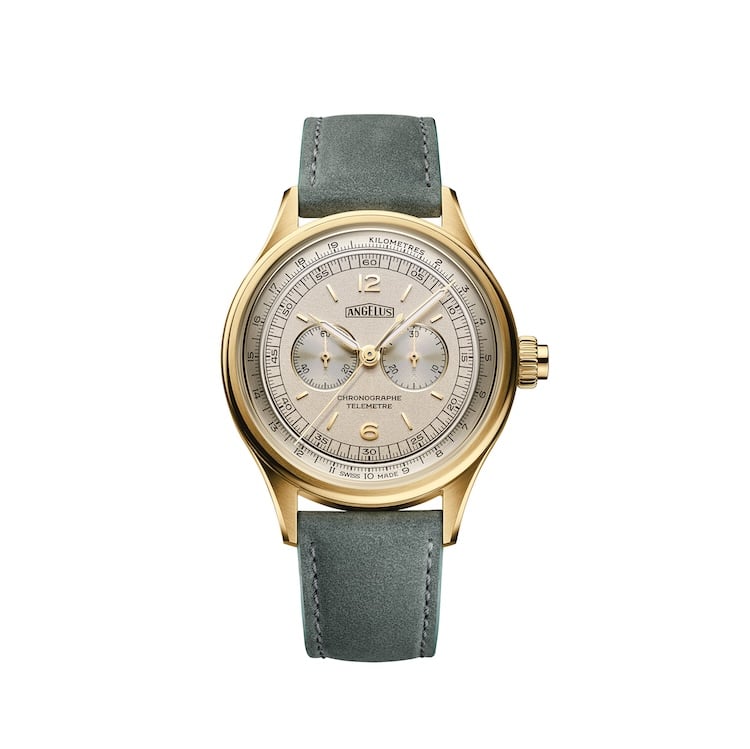 Il nuovo Angelus Chronographe Télémètre è disponibile in tre varianti: acciaio con quadrante rosa o grigio (25 pezzi ciascuna) e oro giallo con quadrante bianco-nickel (15 pezzi). I cinturini in pelle di vitello — blu acciaio, grigio antracite o verde salvia — completano l’insieme con tonalità sobrie e sofisticate.