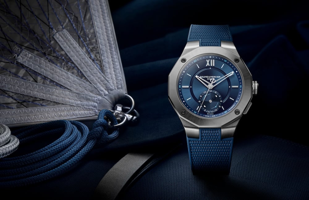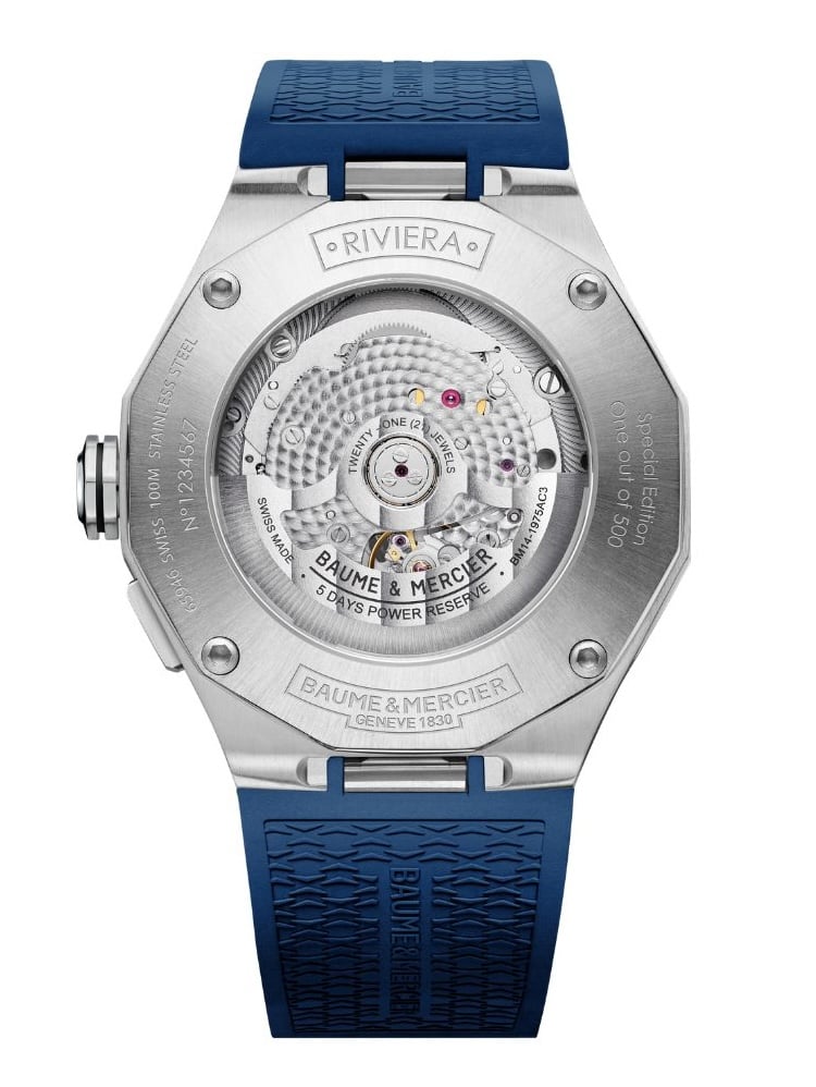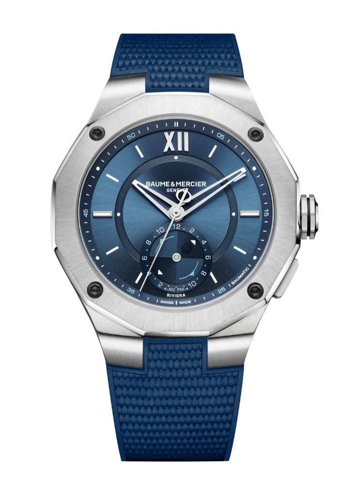 All’interno, il Riviera Maréographe ospita il movimento automatico di manifattura Baumatic con riserva di carica di 120 ore e protezione contro i campi magnetici. La garanzia è di 6 anni. Accompagnato da cinturino integrato in caucciù blu con pattern tela, l’orologio Baume & Mercier è disponibile al prezzo di 5.390 euro.