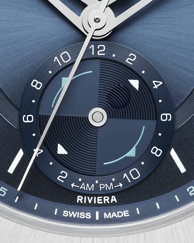 Realizzato in edizione limita a 500 esemplari, il Riviera Maréographe ha una cassa dodecagonale in acciaio inossidabile con finitura lucida e satinata di 43 mm di diametro e 12,3 mm di spessore, protetta da un vetro zaffiro antigraffio con trattamento antiriflesso su entrambi i lati ed impermeabile fino a 100 metri.