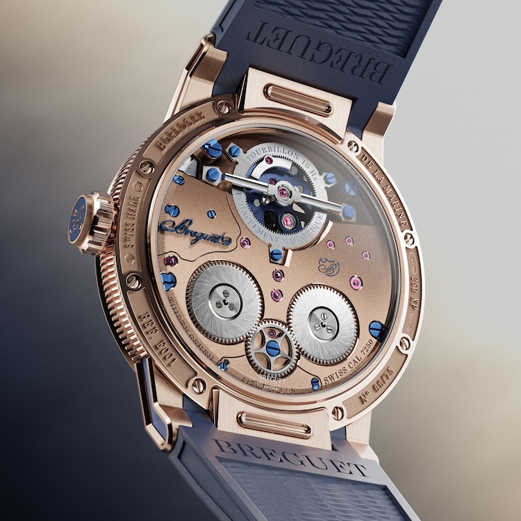 La cassa in oro Breguet misura 43,5 mm di diametro e 13,3 mm di spessore. Le proporzioni richiamano i canoni della collezione Marine, con carrure scanalata a doppia finitura e anse applicate, alcune delle quali dedicate al sistema di intercambiabilità del cinturino in caucciù blu.
